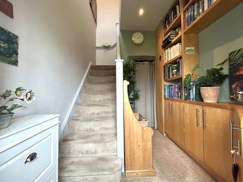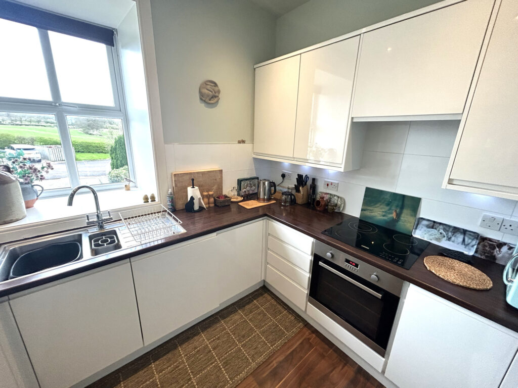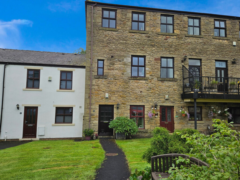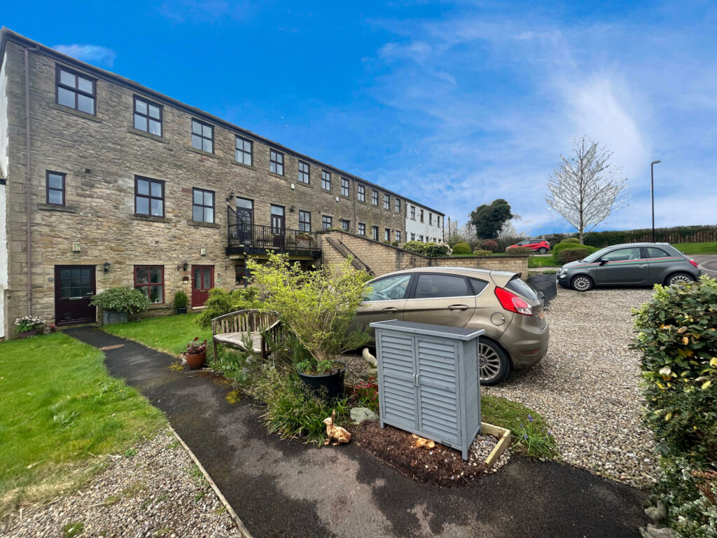 This low maintenance town house, converted from an original mill-workers’ building, has spacious accommodation spread over three floors, with high ceilings, glazed internal doors and deep window recesses providing a light, airy atmosphere throughout. The ground floor entrance hall offers plenty of space for storing coats and shoes, and has additional bespoke built-in shelving providing further storage. Stairs lead up to the 1st floor where a spacious landing leads to a lounge and kitchen. The lounge is a good size, with two windows providing plenty of light, and features a cast iron wood burner. The kitchen, with countryside views, is an easy-clean modern design providing plenty of storage and worktop space, as well as a built-in oven and hob. Stairs up to the 2nd floor arrive on a landing area giving access to two double bedrooms, both offering spectacular views of the surrounding countryside, and the house bathroom, equipped with a modern three-piece suite including power shower.