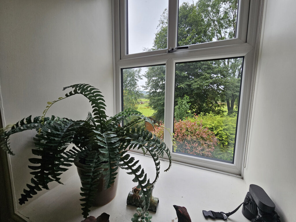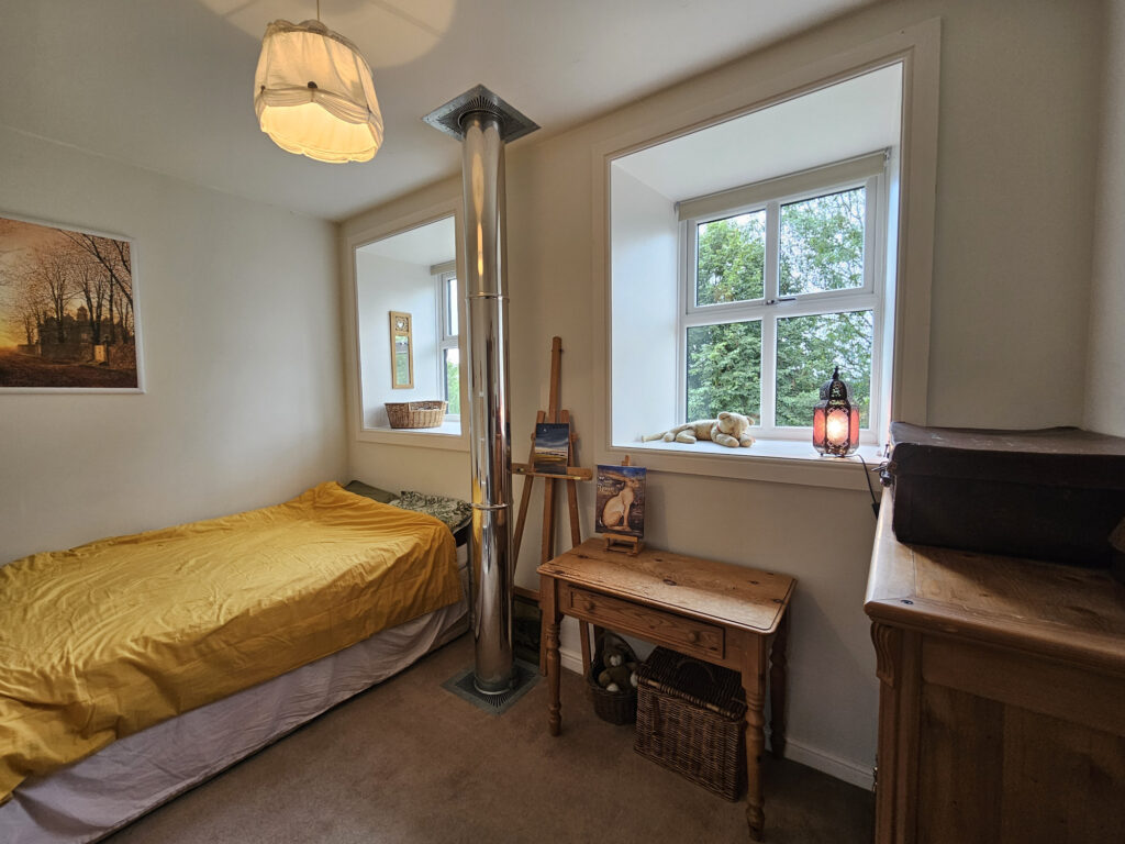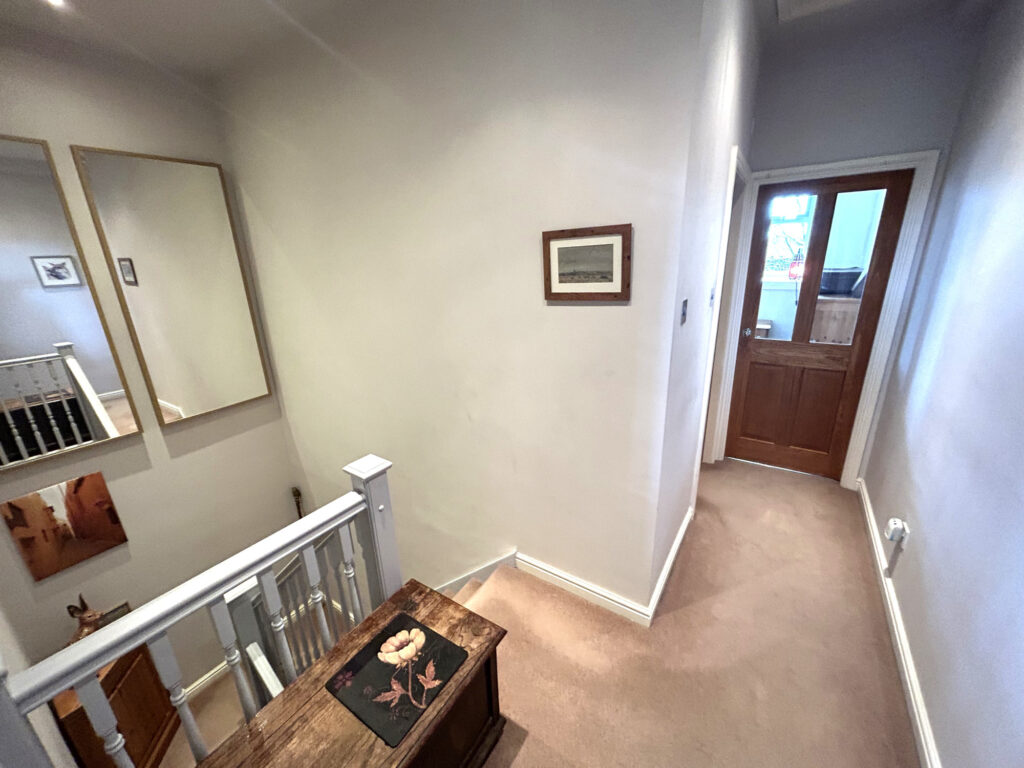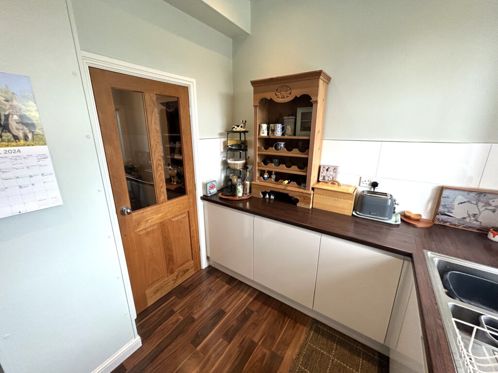 This low maintenance town house, converted from an original mill-workers’ building, has spacious accommodation spread over three floors, with high ceilings, glazed internal doors and deep window recesses providing a light, airy atmosphere throughout. The ground floor entrance hall offers plenty of space for storing coats and shoes, and has additional bespoke built-in shelving providing further storage. Stairs lead up to the 1st floor where a spacious landing leads to a lounge and kitchen. The lounge is a good size, with two windows providing plenty of light, and features a cast iron wood burner. The kitchen, with countryside views, is an easy-clean modern design providing plenty of storage and worktop space, as well as a built-in oven and hob. Stairs up to the 2nd floor arrive on a landing area giving access to two double bedrooms, both offering spectacular views of the surrounding countryside, and the house bathroom, equipped with a modern three-piece suite including power shower.