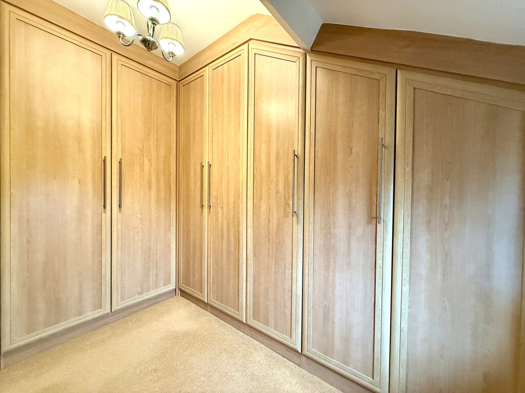 The master bedroom is a serene retreat, featuring a spacious double layout and a charming window overlooking the front, inviting natural light and creating an airy atmosphere. Bedroom two offers another generous double space, complete with elegant fitted wardrobes that maximize storage and maintain a clean, uncluttered aesthetic. A delightful third bedroom, currently transformed into a chic dressing room, boasts fitted wardrobes on both sides, a perfect space for fashion enthusiasts or those seeking a versatile additional room. The shower room is a true highlight, featuring a luxurious double walk-in shower with sophisticated glass screening. Complemented by double hand wash basins with convenient under-storage, chrome fixtures, and harmonious wall and floor coverings, this space epitomizes modern bathroom design. A large storage cupboard adds practical convenience, ensuring every inch of the property is thoughtfully designed.