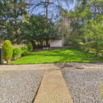A delightful garden shed with its own seating area creates a unique retreat, ideal for enjoying a morning coffee, an evening drink, or simply soaking in the serene forest views and sounds of nature.