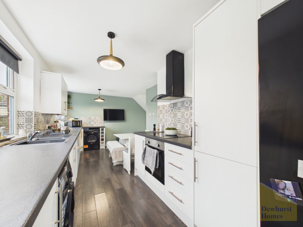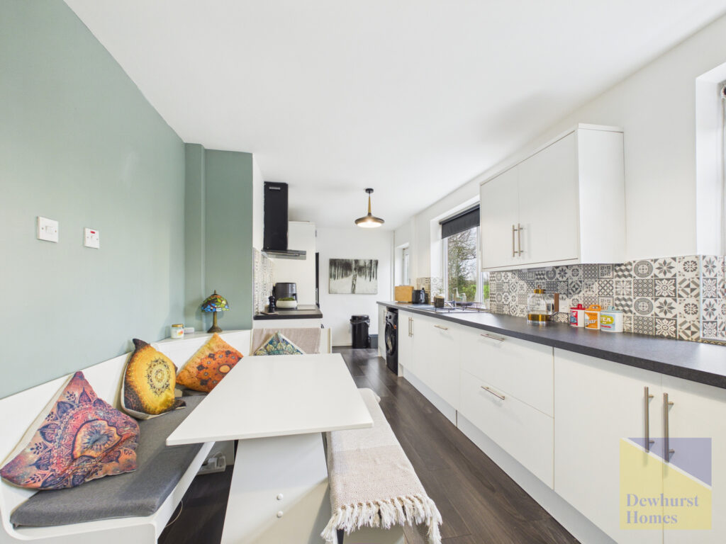 To the rear of the property, the dining room enjoys pleasant views over the garden and open countryside beyond, providing a lovely setting for family meals or entertaining. The kitchen is well arranged with a range of base and wall units, integrated appliances including an electric cooker and hob, and an integral fridge. A window positioned above the sink takes full advantage of the beautiful countryside outlook, while a door provides direct access to the rear garden. A useful pantry area adds further practical storage.