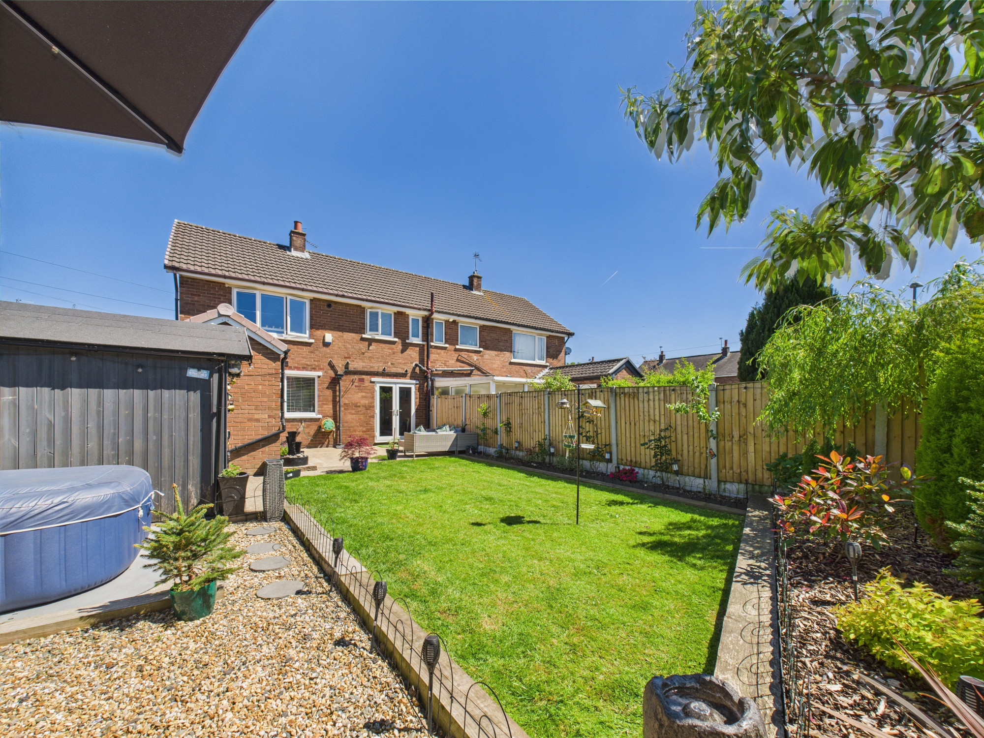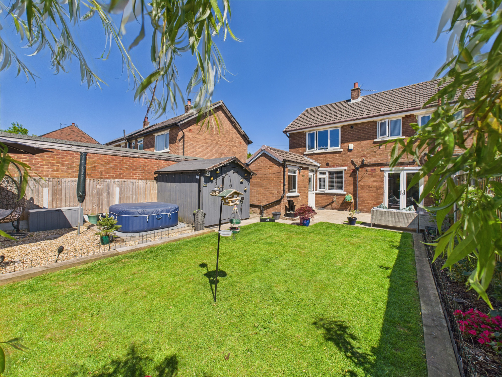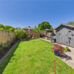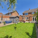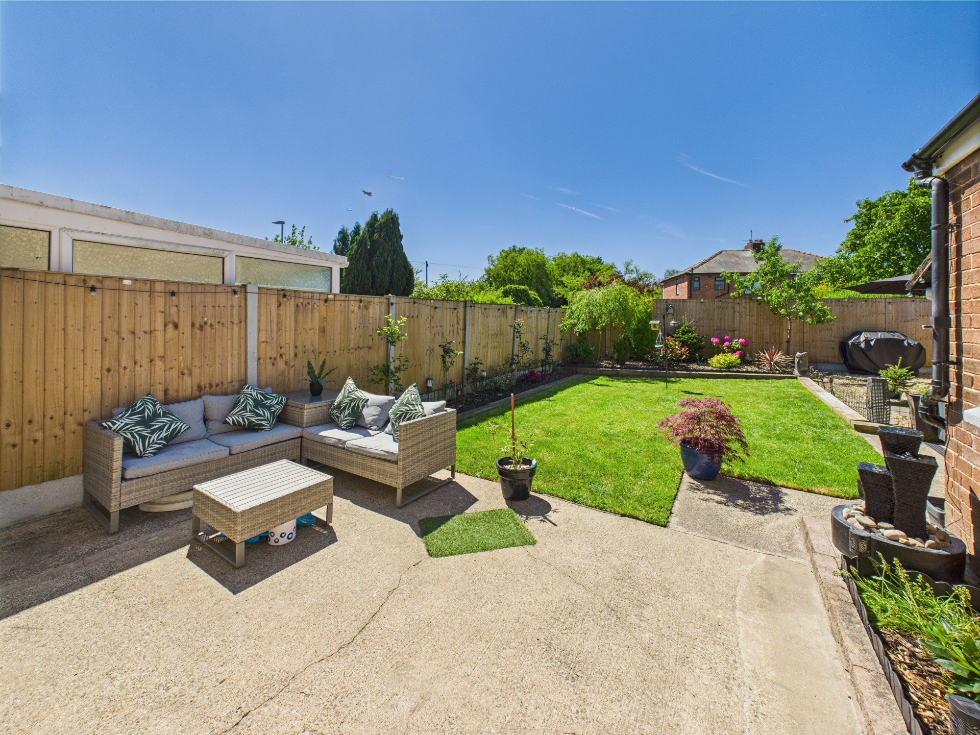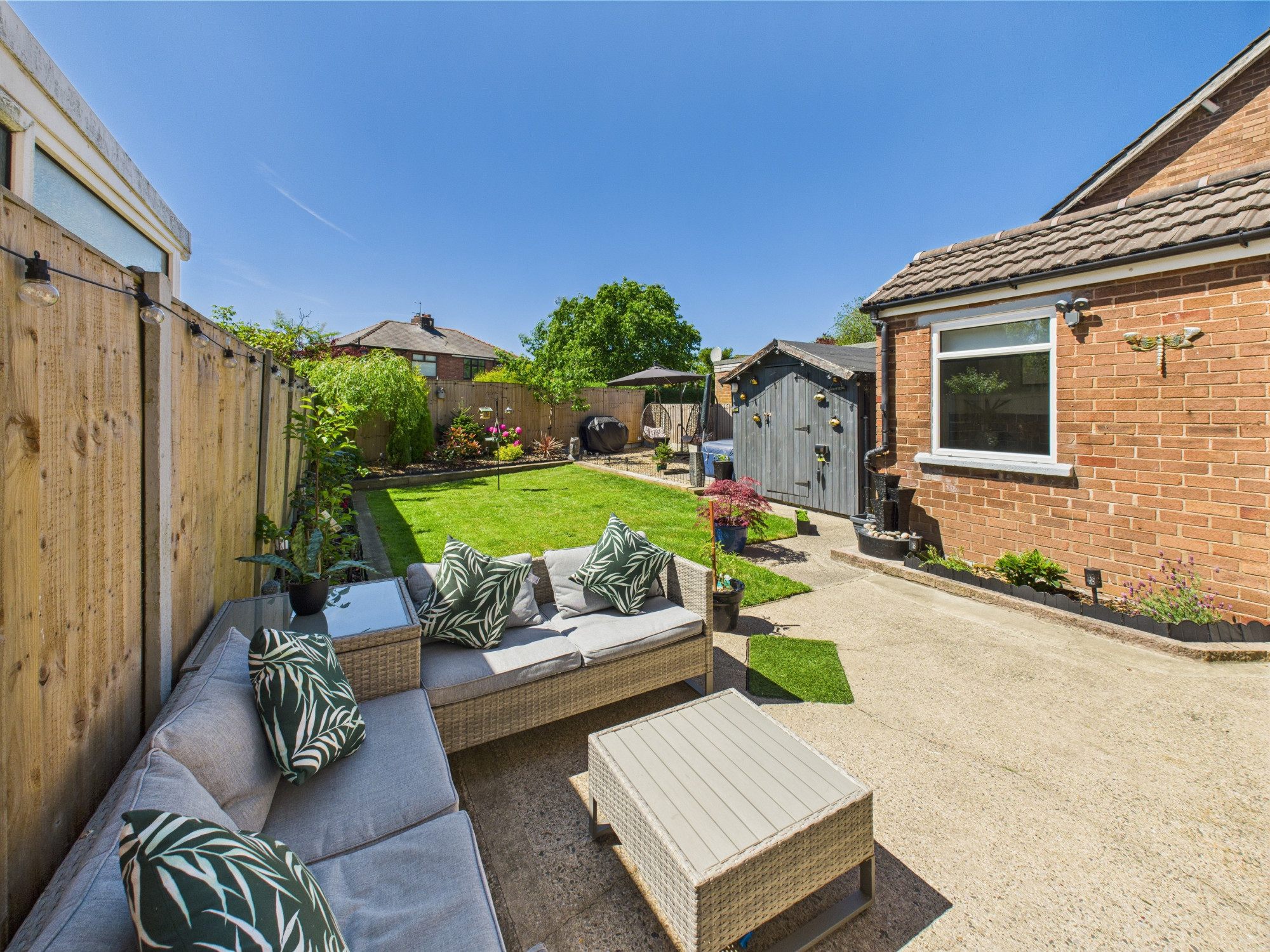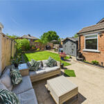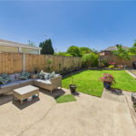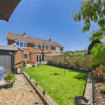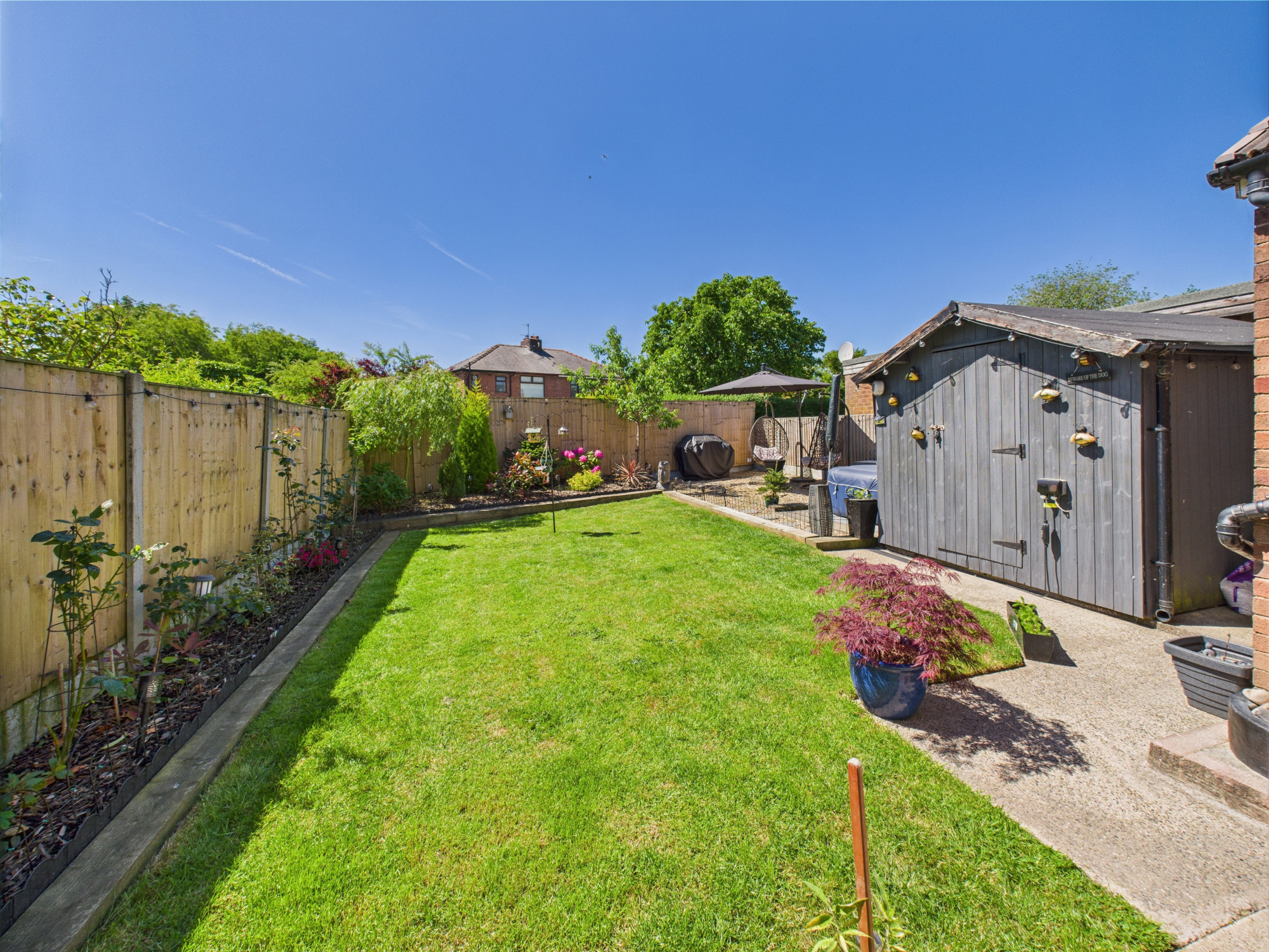Mainly laid to lawn and framed by railway sleeper borders filled with seasonal planting, the garden also features a gravelled patio area, perfect for al fresco dining. A timber shed offers handy storage for garden tools, bikes, or outdoor furniture.