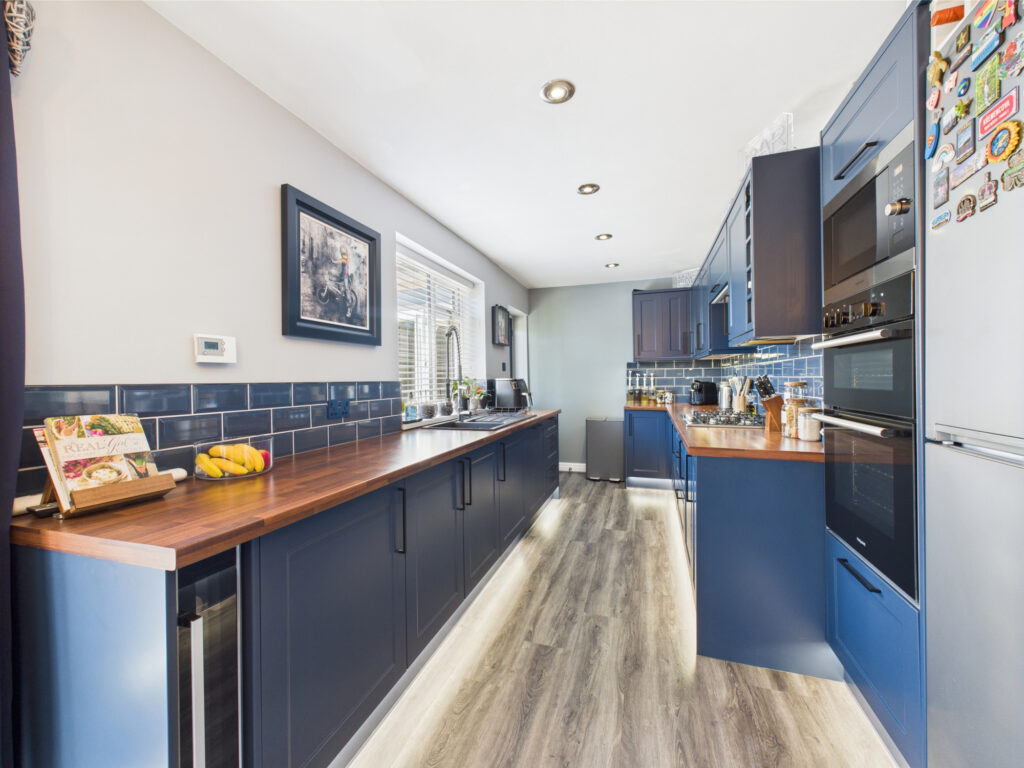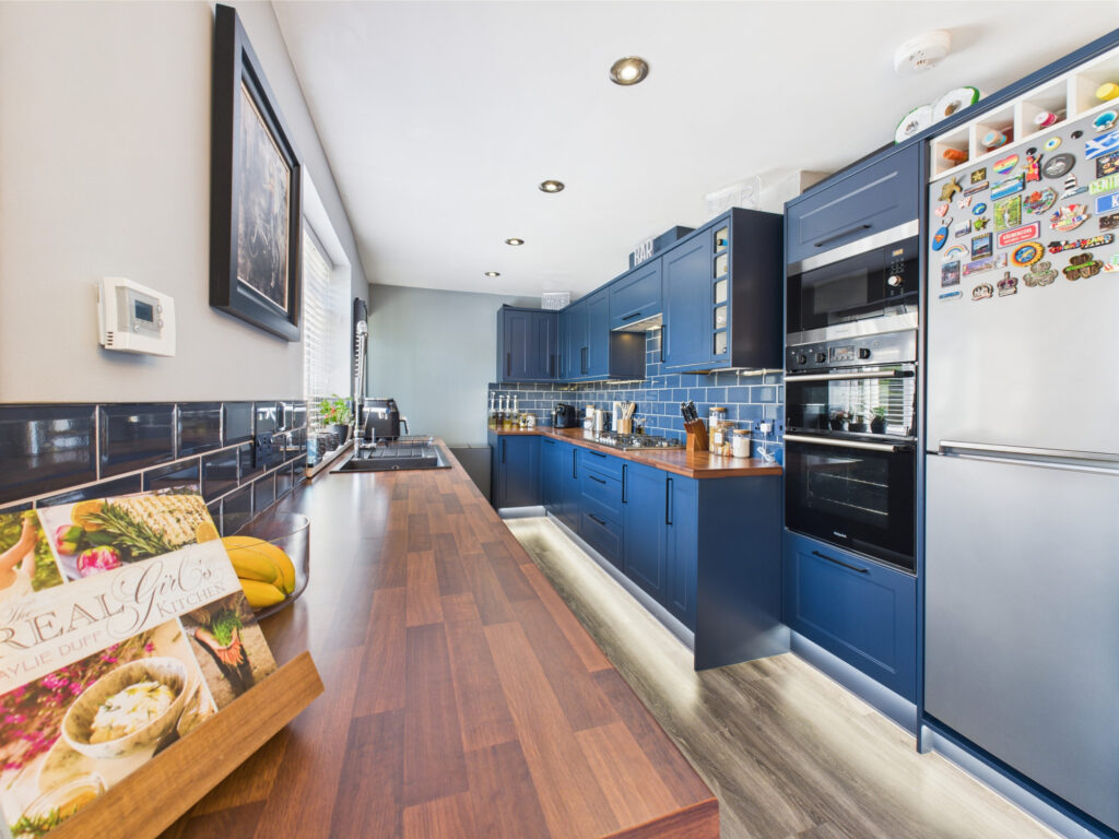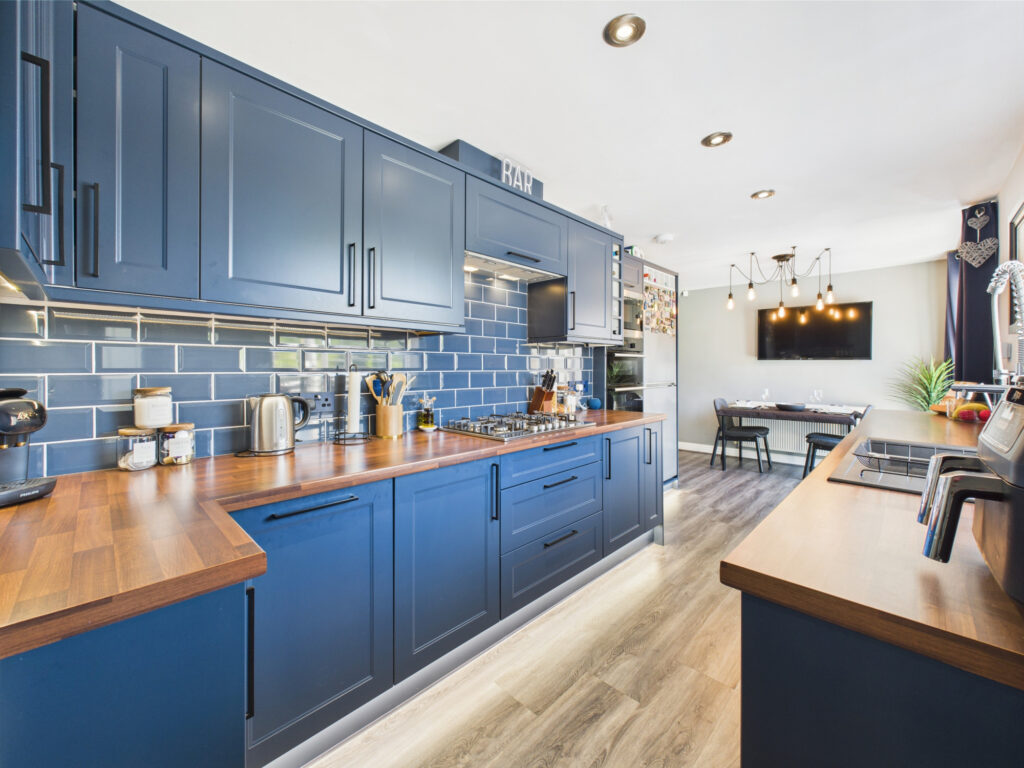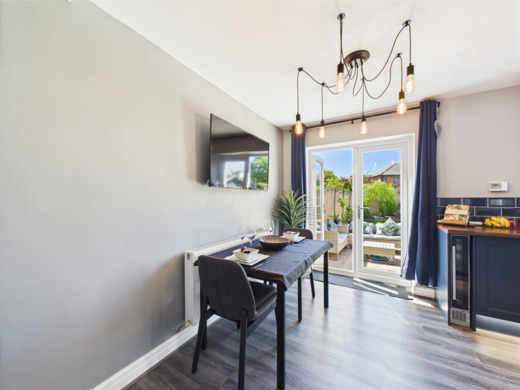 Step through the front door into a welcoming and stylish entrance hallway that sets the tone for the rest of the home. To the front, the living room is a cosy yet spacious retreat, with a beautiful feature log burner creating the perfect focal point for relaxing evenings with family or friends. The rear of the home opens up into an impressive and sociable open plan dining kitchen—a real showstopper space. Designed with both practicality and style in mind, the kitchen features an extensive range of modern units, complementary worktops, and a full suite of high-end integrated appliances, ideal for cooking and entertaining alike. The dining area offers ample space for a large table and benefits from French doors that lead straight out into the garden, allowing the indoors and outdoors to connect effortlessly—especially during those sunny summer months. A cleverly designed utility room sits just off the kitchen, fitted with additional storage units, a sink, and plumbing for laundry appliances—keeping the main living areas clutter-free and functional.