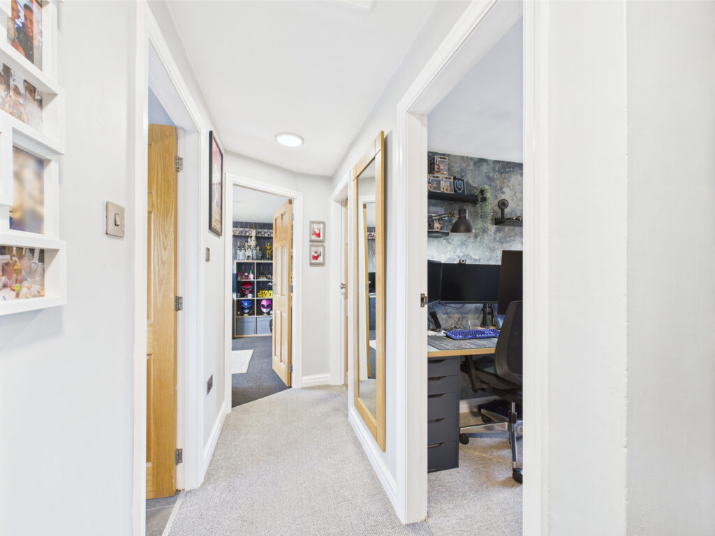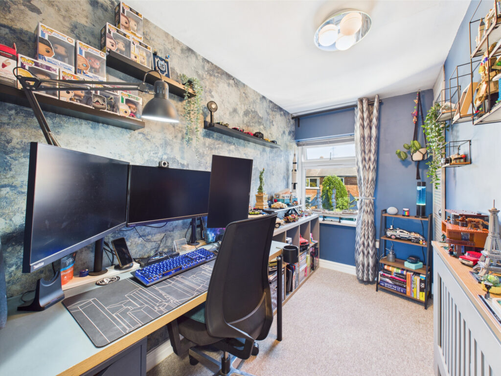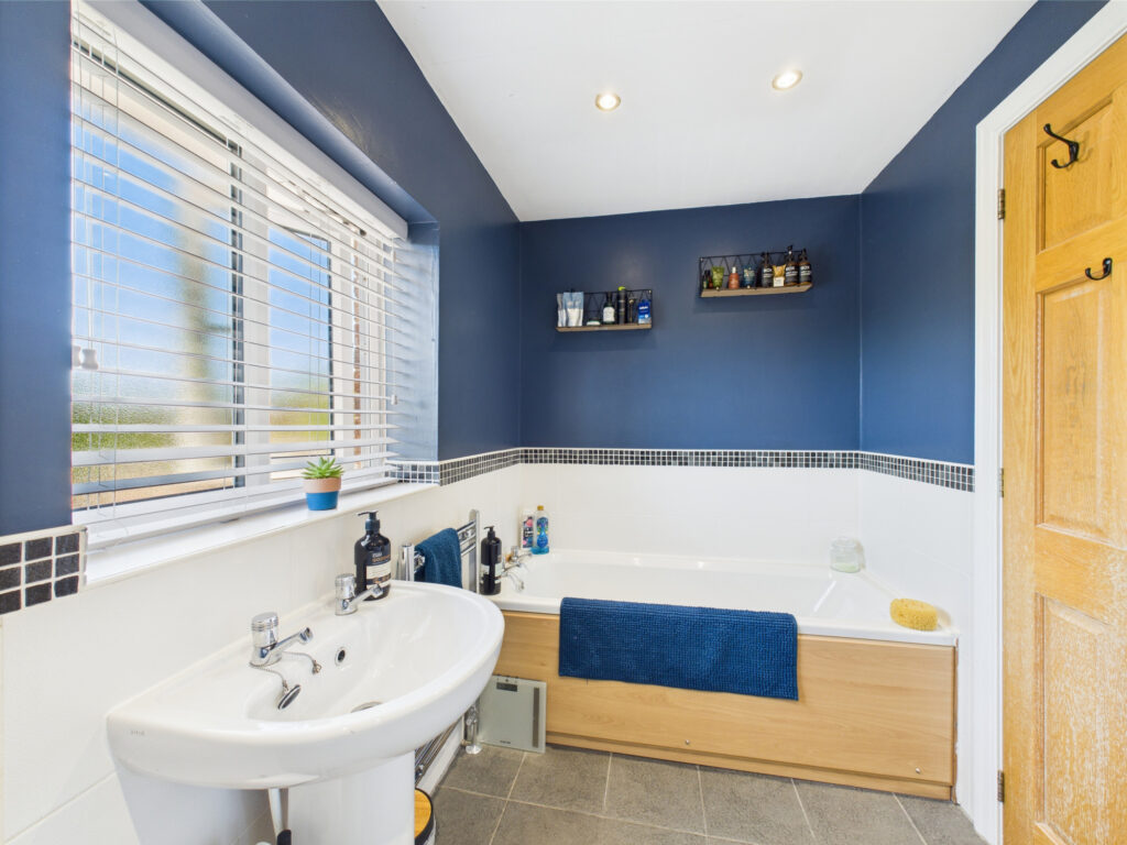 Upstairs, the property continues to impress with three well-proportioned bedrooms. The master bedroom is a spacious double with built-in wardrobes, offering a stylish and tranquil retreat at the end of the day. A second double bedroom provides more flexibility—ideal for guests or family members—while the third single bedroom works well as a child’s room, nursery, or a bright and peaceful home office. The contemporary family bathroom is another highlight. Finished to a high standard, it features a four-piece suite, including a separate shower and bath, sleek fittings, and tasteful part-tiled walls for a clean, modern look.