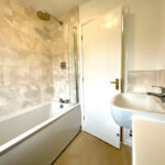 The family bathroom is finished in a clean, contemporary style, featuring a built-in vanity unit, part-tiled walls, and modern fittings.
