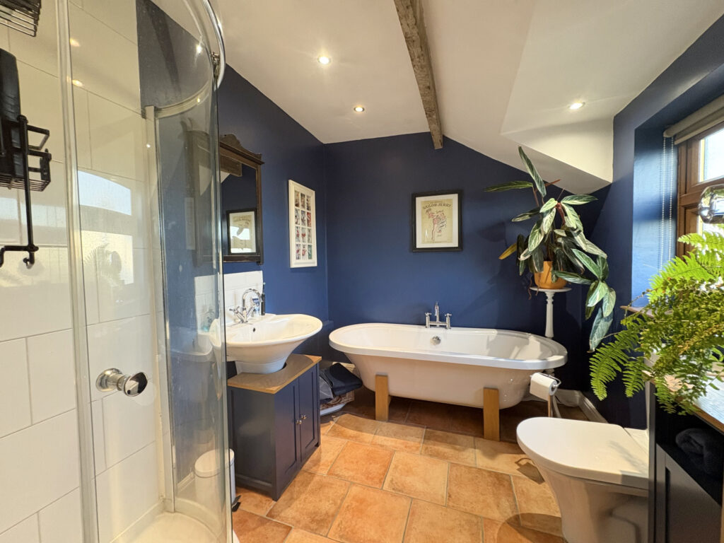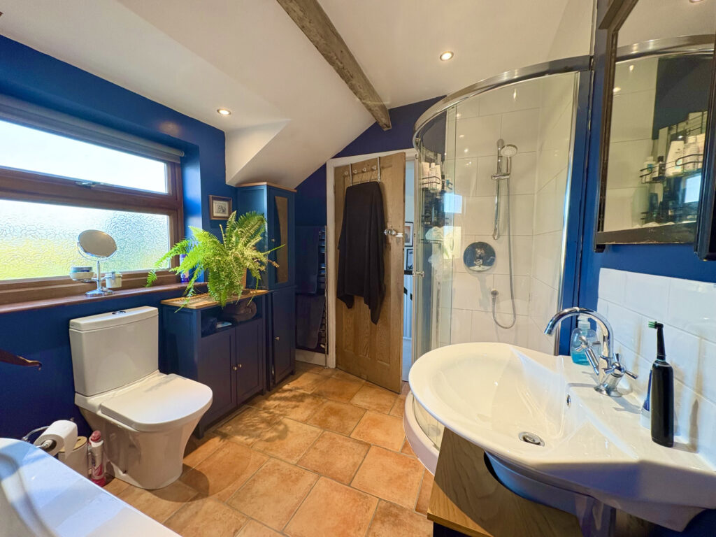 The four piece family bathroom has been thoughtfully designed with part tiled walls, roll top bath, corner shower unit. WC, and wash hand basin. A frosted window allows plenty of light, whilst retaining privacy and there is a heated towel rail for added convenience, exposed beams and an extractor fan.