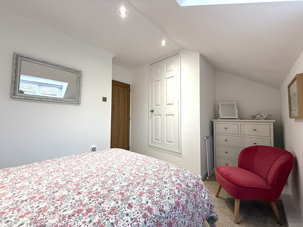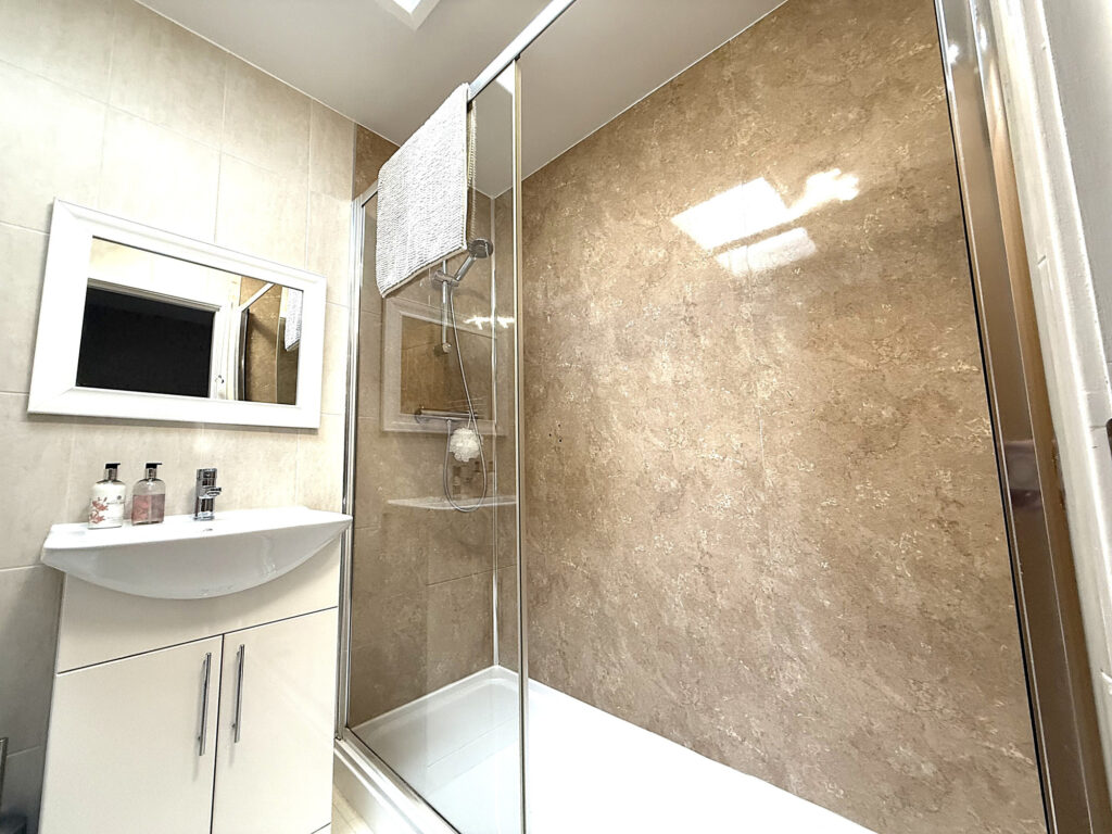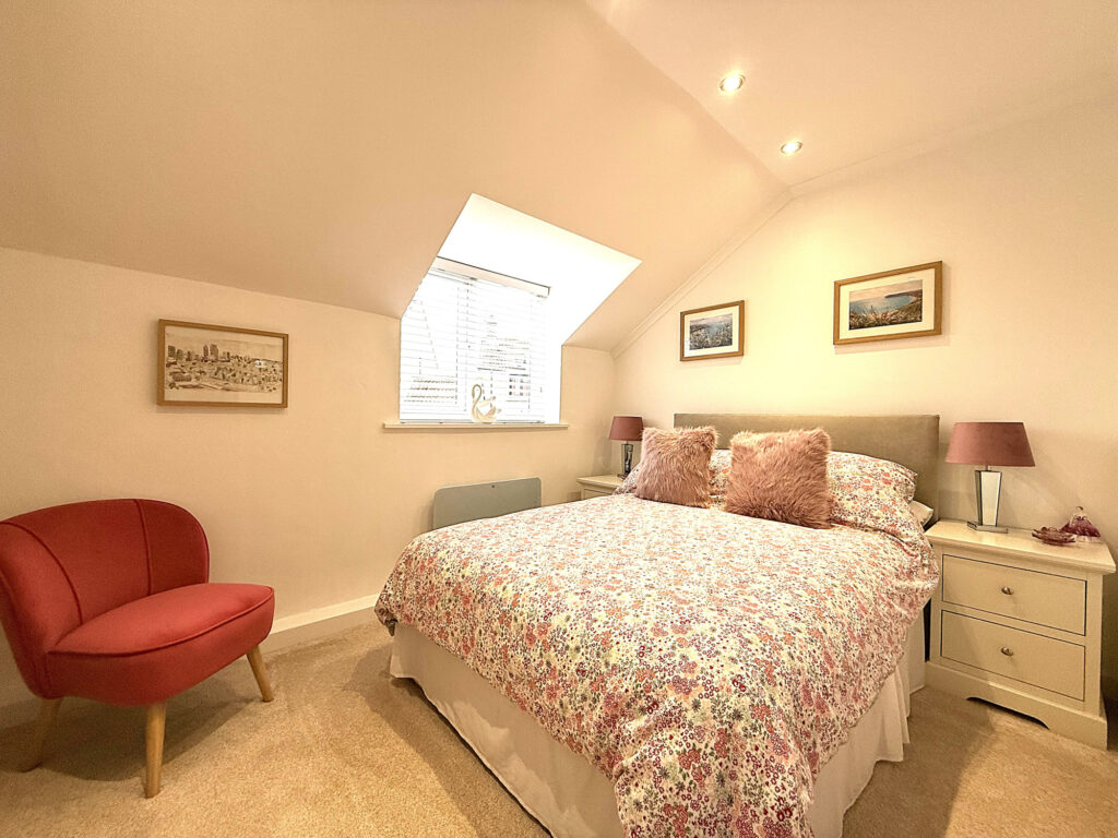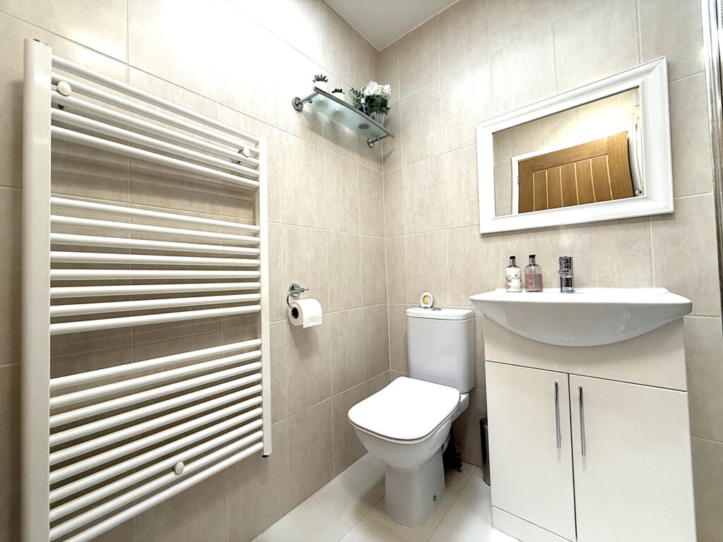As you ascend the stairs to the first floor, you’ll find this charming space, where every room and the loft await your exploration. Let’s start with Bedroom One, it's such a lovely spot With its extended window and a Velux window up top, this room is practically drenched in sunlight, making it feel bright and inviting. Perfect for lazy mornings or a peaceful night's sleep. Then there’s Bedroom Two, which doesn’t skimp on space either. It’s double-sized and comes with a cute storage nook and a handy storage cupboard. Whether you need a place for clothes, books, or that collection of board games, you’ve got options. The shower room is beautiful. You’ll love the double walk-in shower with a sleek glass screen. Imagine stepping in after a long day, the heated towel rail is a nice touch, keeping things cozy. Plus, there's a modern hand wash basin with a mixer tap and storage underneath, all set against complimentary tiling that adds a splash of style.