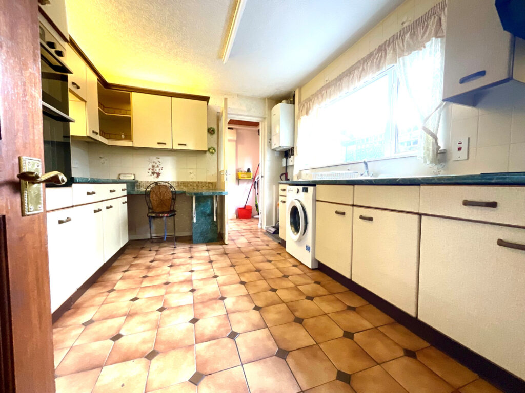 The well-proportioned kitchen is fitted with a double oven, electric halogen hob, fridge freezer, washing machine, and a relatively new Worcester boiler. From here, you’re led into a storage area with dual outdoor access points, flowing into a practical utility room complete with an additional sink and oven.