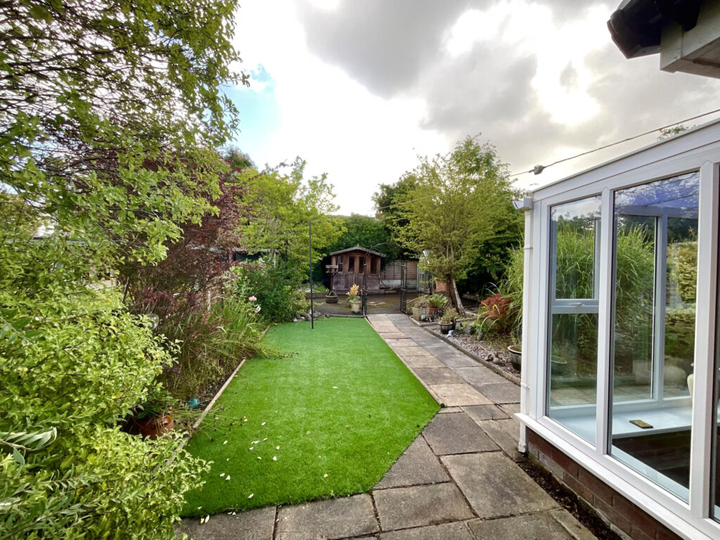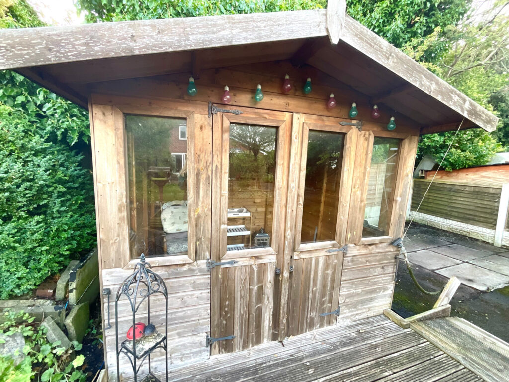 Outside, the driveway comfortably accommodates up to four vehicles. The rear garden is not overlooked, featuring low-maintenance artificial grass, mature shrubs, and an arched walkway leading to a charming summer house — perfect for relaxing or hobbies. There's also a shed and greenhouse, ideal for gardening enthusiasts.