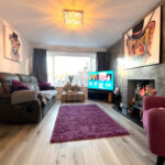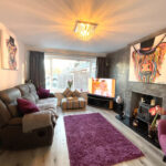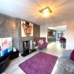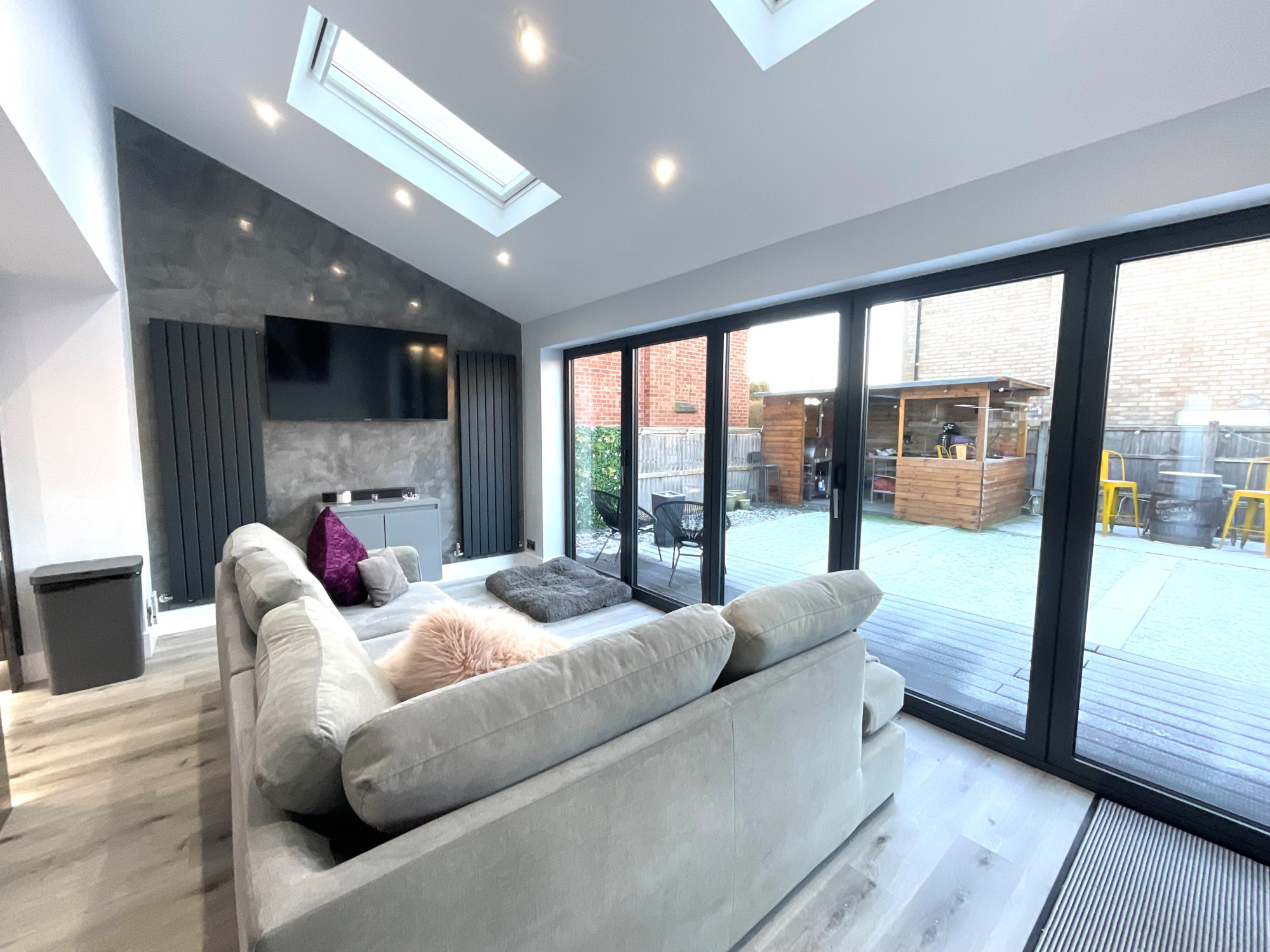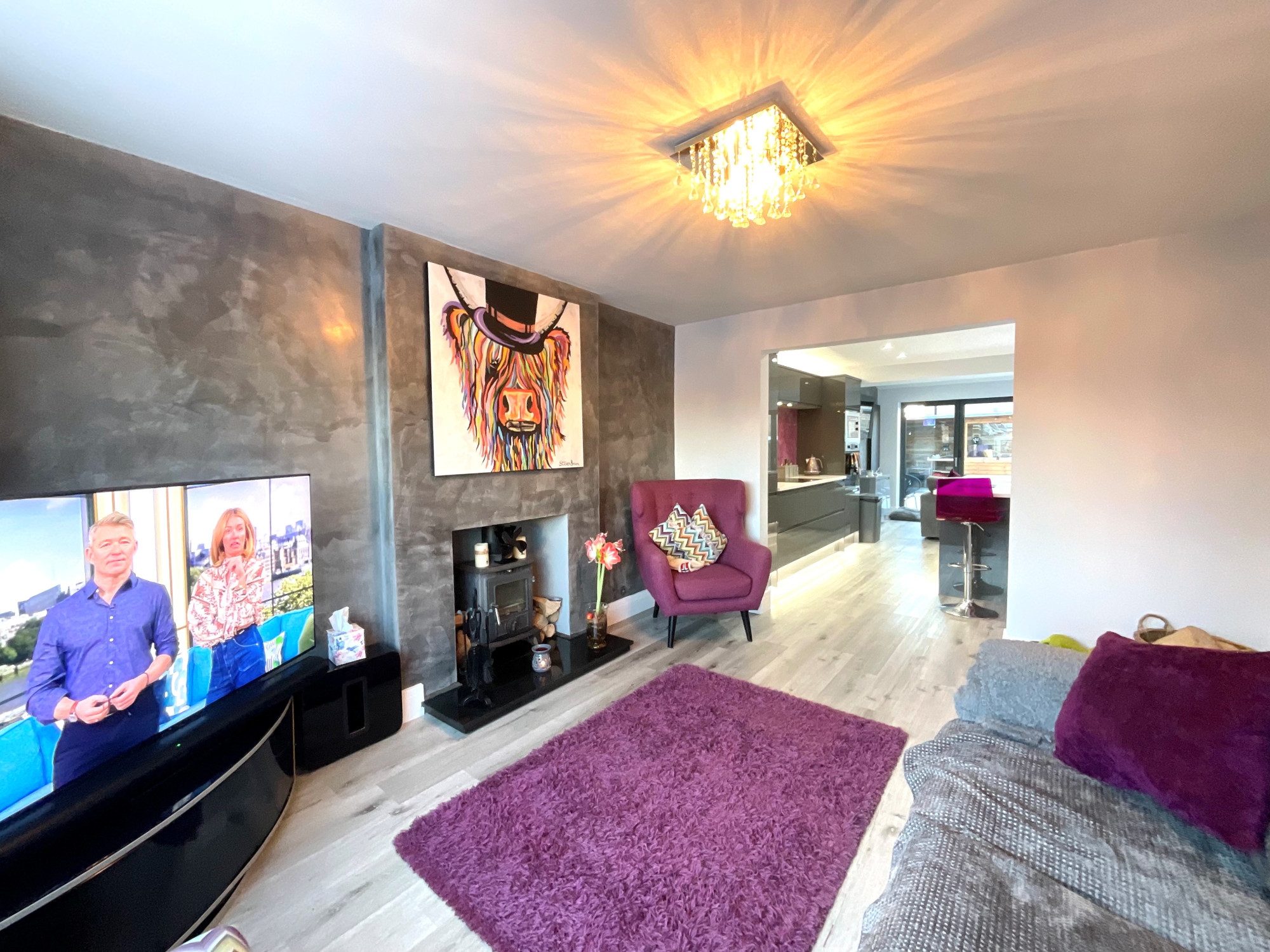 Upon entering, you are welcomed into a spacious hallway finished with sleek pastel grey laminate flooring, immediately setting the tone for the quality found throughout the home. The heart of the property is the stunning open-plan kitchen, dining, lounge and family area, perfectly designed for modern family life and entertaining. The kitchen features a statement island providing additional storage, complemented by tall decorative radiators and an abundance of natural light. Bi-fold doors open seamlessly onto the rear garden, creating an excellent indoor-outdoor flow. The lounge area enjoys a cosy log burner and a large front-facing window, offering both warmth and character.