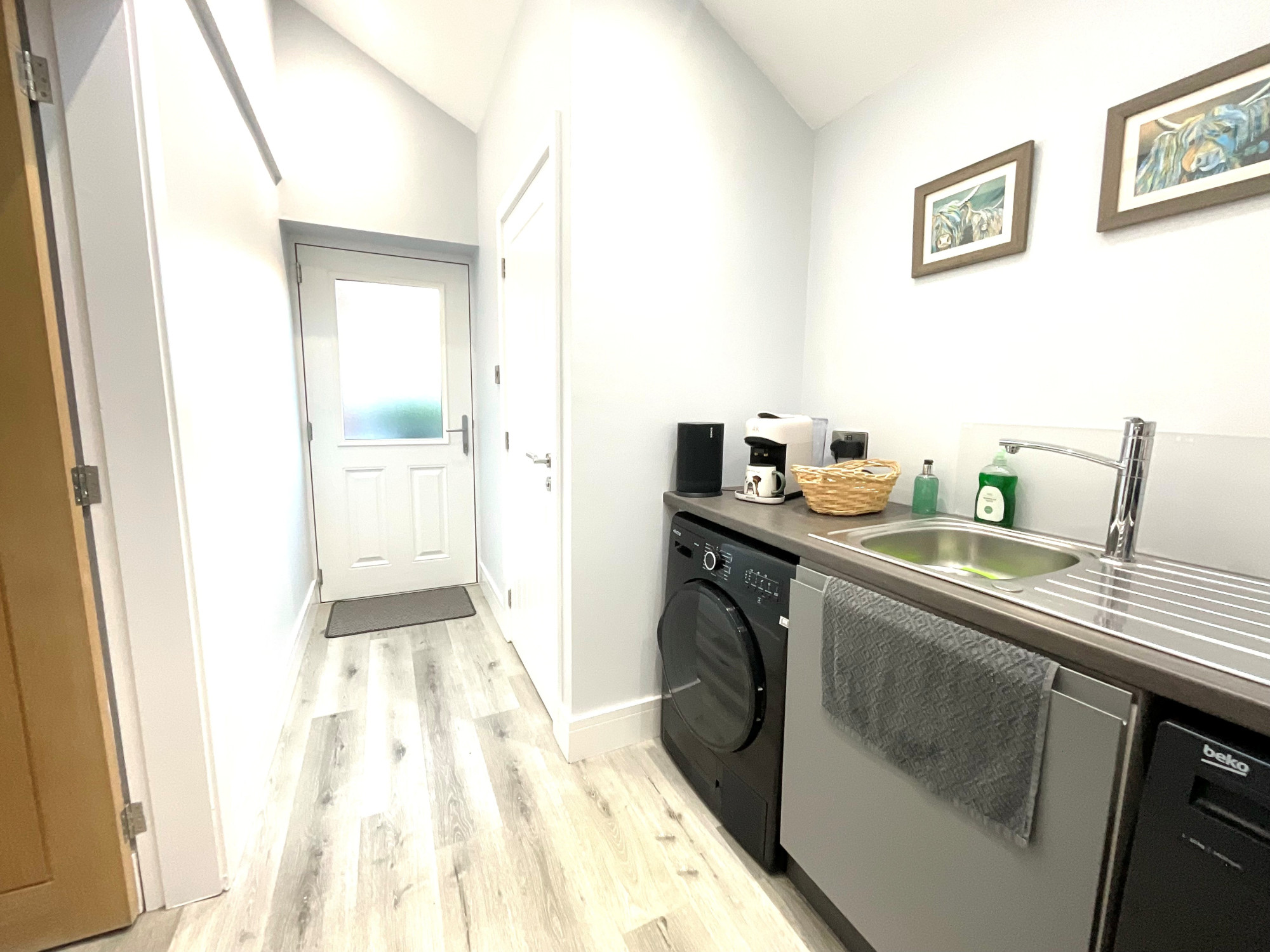 The ground floor also benefits from a convenient WC and a fully plumbed utility room, providing practical space for appliances. Additionally, there is a small integral garage/store room, complete with electric supply, remote-controlled door and a Velux roof window, offering flexible storage or workshop potential.