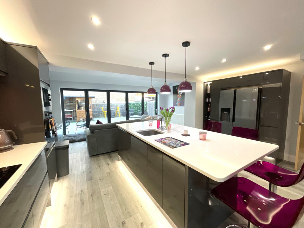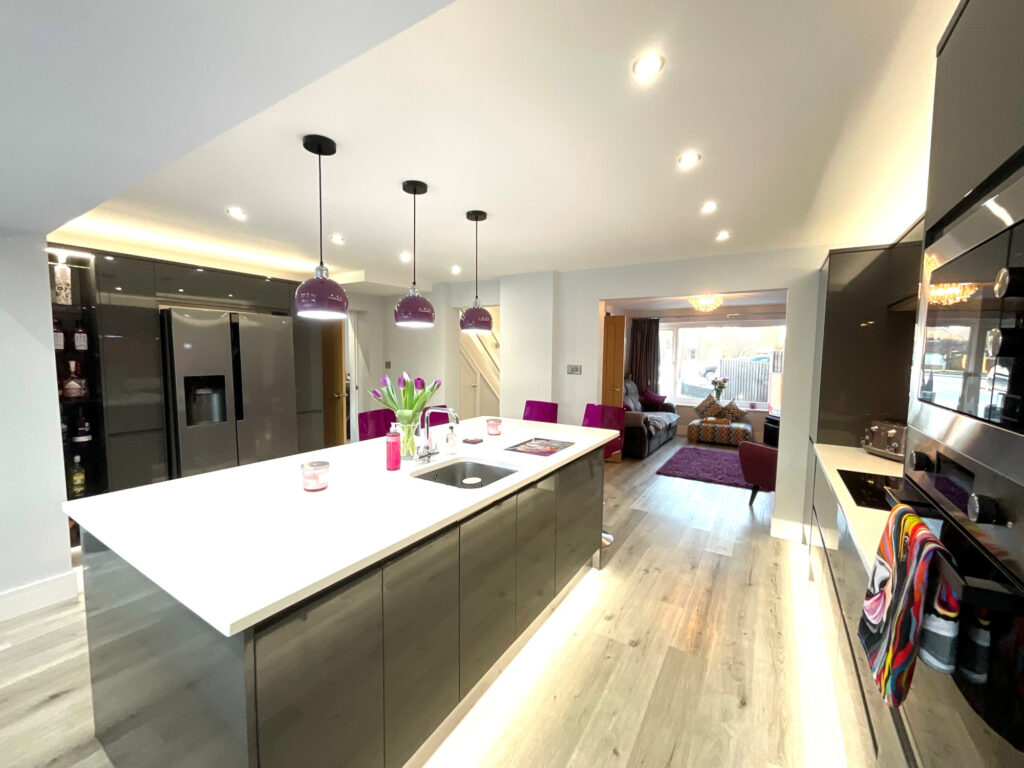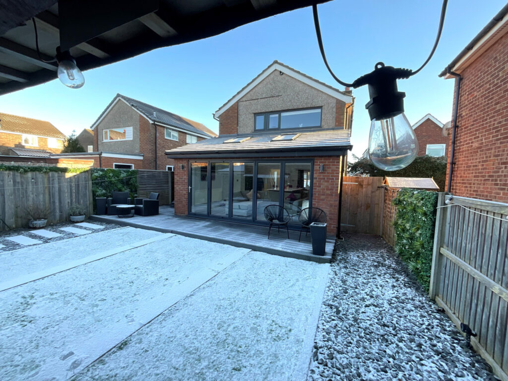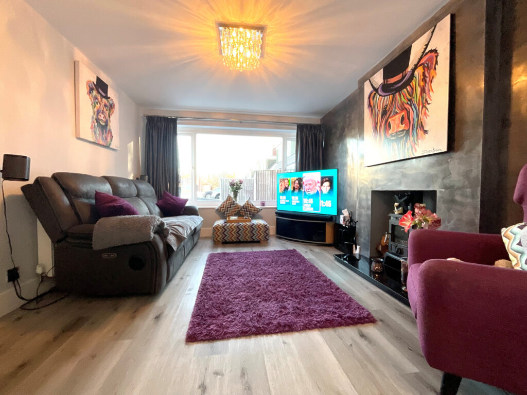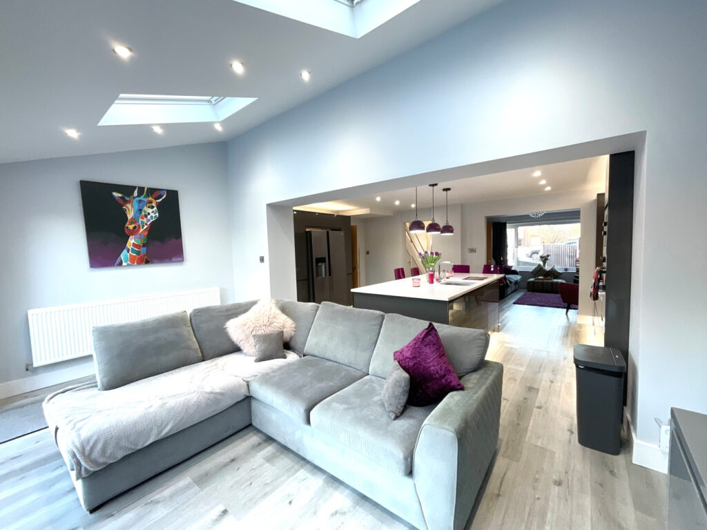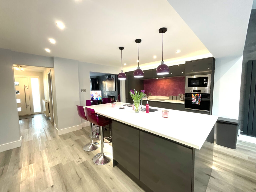 Upon entering, you are welcomed into a spacious hallway finished with sleek pastel grey laminate flooring, immediately setting the tone for the quality found throughout the home. The heart of the property is the stunning open-plan kitchen, dining, lounge and family area, perfectly designed for modern family life and entertaining. The kitchen features a statement island providing additional storage, complemented by tall decorative radiators and an abundance of natural light. Bi-fold doors open seamlessly onto the rear garden, creating an excellent indoor-outdoor flow. The lounge area enjoys a cosy log burner and a large front-facing window, offering both warmth and character.