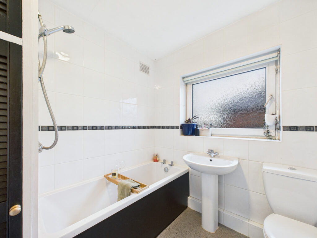 To the first floor, the property offers three well-proportioned bedrooms, two of which comfortably accommodate double beds and additional furniture and fitted wardrobes. The family bathroom has been newly updated and comprises a modern three-piece suite in white, including a shower over the bath, WC and wash hand basin.