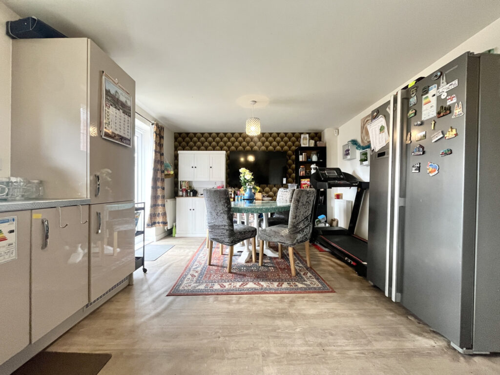 To the rear of the home is a generous kitchen diner, ideal for family life and hosting. The kitchen is equipped with integrated appliances, offering ample worktop space and a sleek modern finish. The open-plan layout accommodates both dining and everyday living with ease.