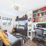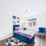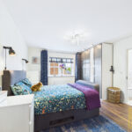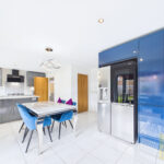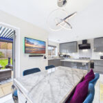 At the heart of the home lies a truly impressive open-plan dining kitchen. The current owners have enhanced this space with additional wall units and a bespoke corner storage cupboard, maximising both style and functionality. The modern colour palette of grey and cobalt blue works harmoniously, creating a sleek yet welcoming environment. High-end fitted appliances include a five-ring gas hob, double oven, and an upgraded Bosch extractor fan. Bifold doors open out onto the rear garden, flooding the space with natural light and offering seamless indoor-outdoor living.