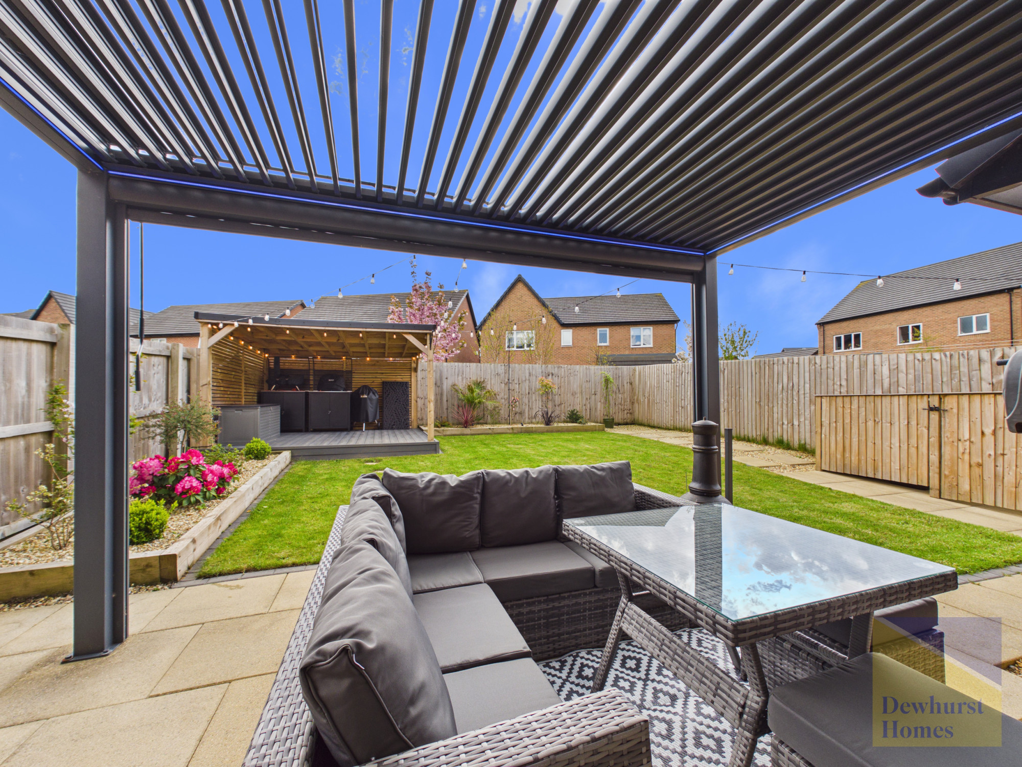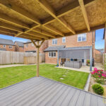 Externally, the property continues to impress. The beautifully landscaped rear garden has been thoughtfully designed for both relaxation and entertaining, featuring two pergola areas—one complete with pull-down shutters and ambient strip lighting, and the other dedicated to a BBQ and outdoor dining space. Further benefits include an outside tap and a cleverly designed bin storage area to keep everything neatly out of sight.