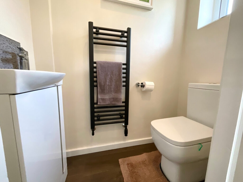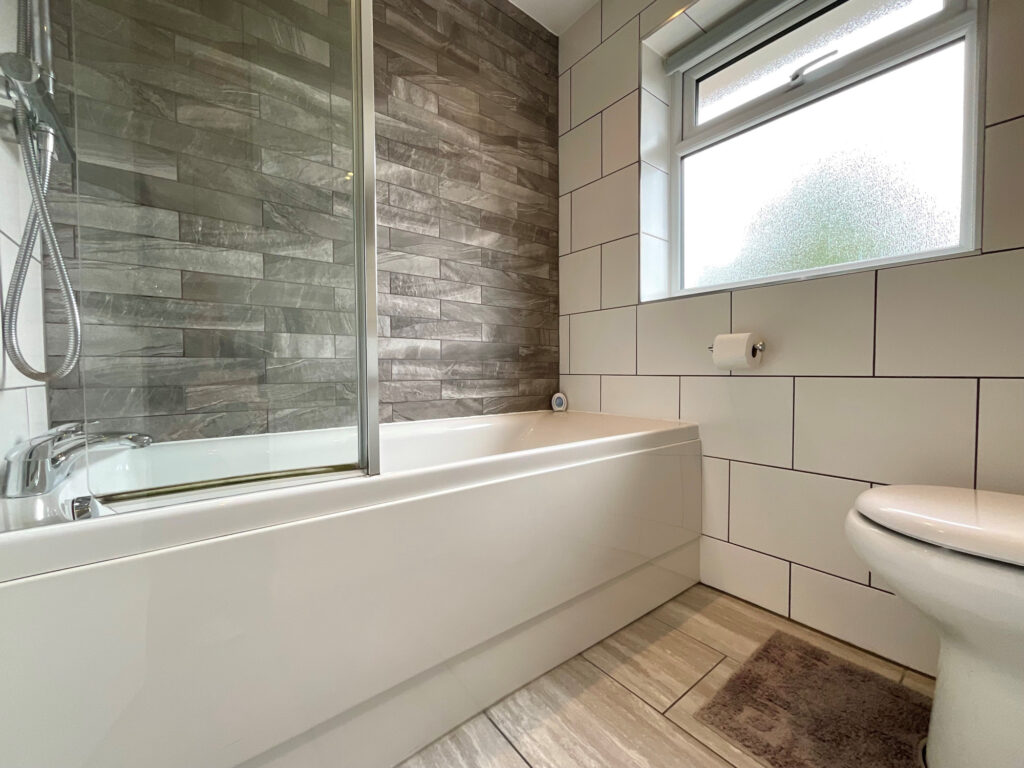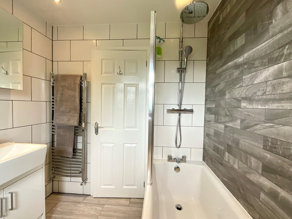 The family bathroom is fully tiled and features an ultra-modern three-piece white suite.