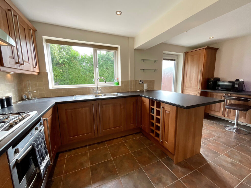 The stylish kitchen/diner is fitted with a range of units and includes an integrated fridge freezer, washing machine, tall standing radiator, storage cupboard (ideal as a pantry), and a bar area with bar stools for casual dining.