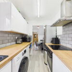 The kitchen is fully functional and well laid out, fitted with modern white gloss units and providing ample storage and worktop space. A rear door offers convenient access to the garden.