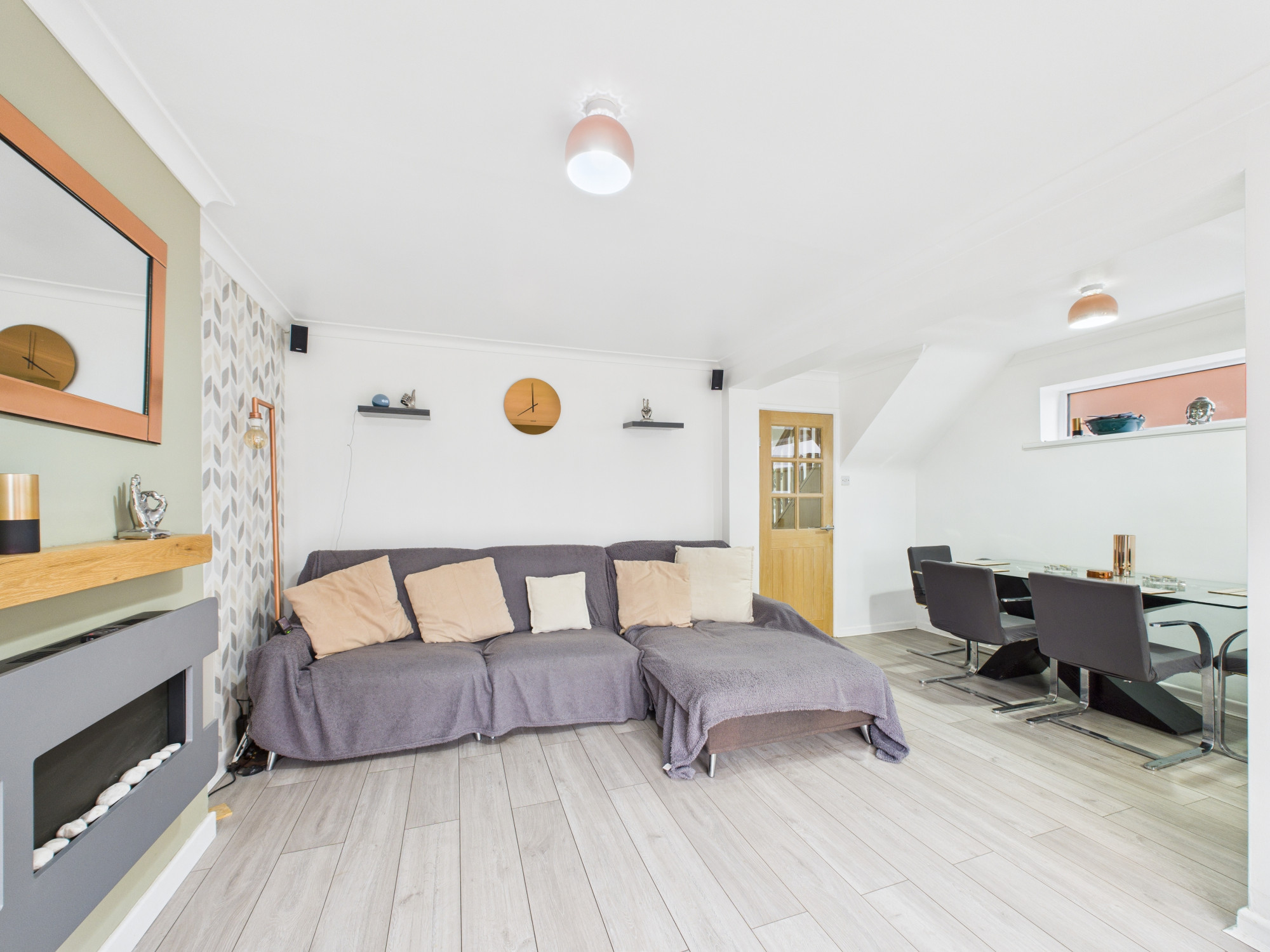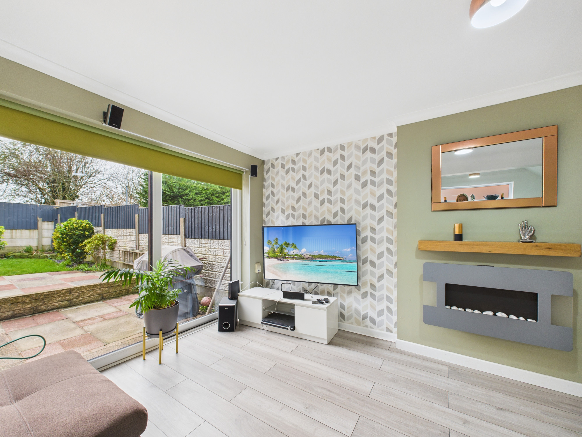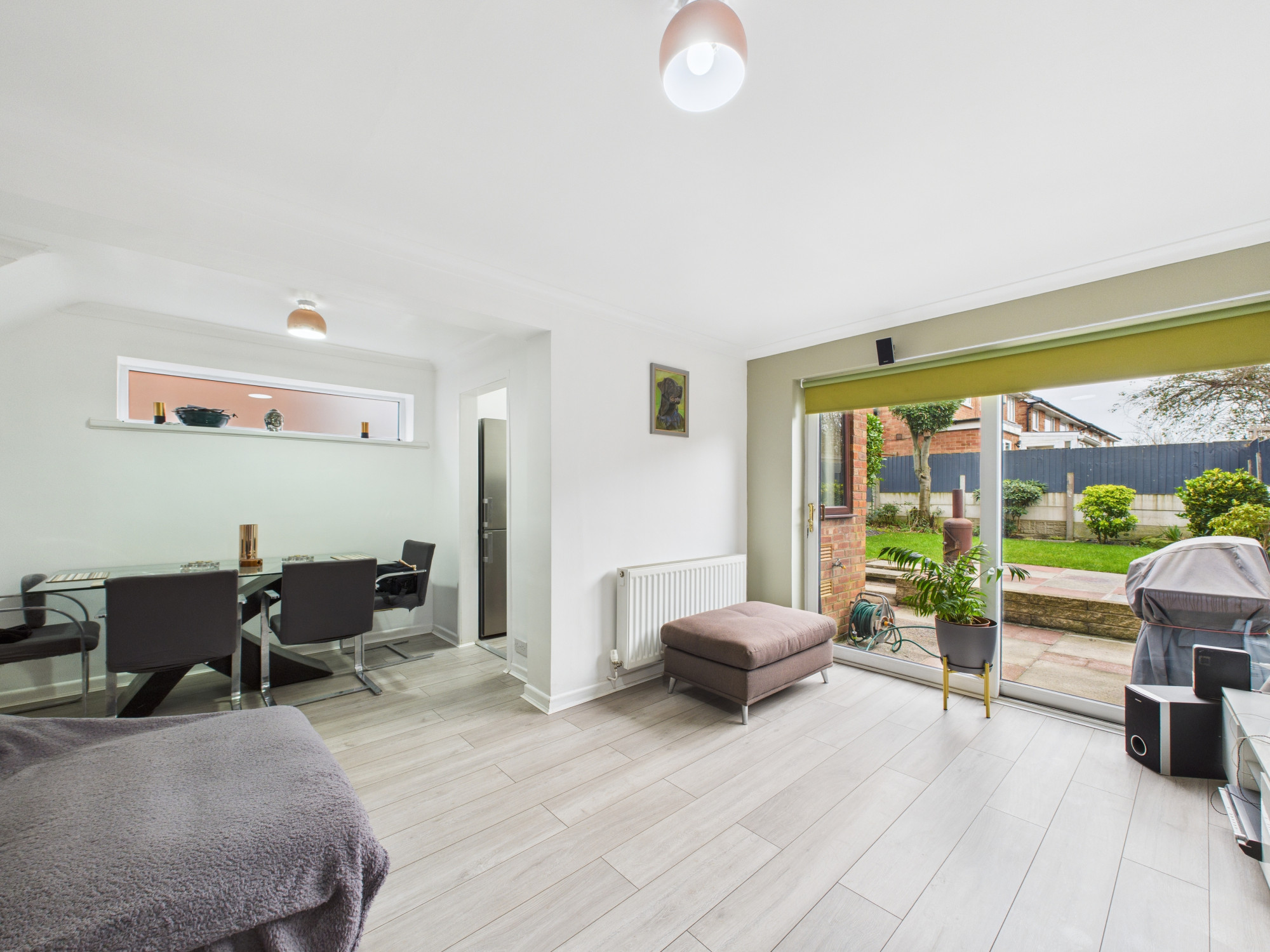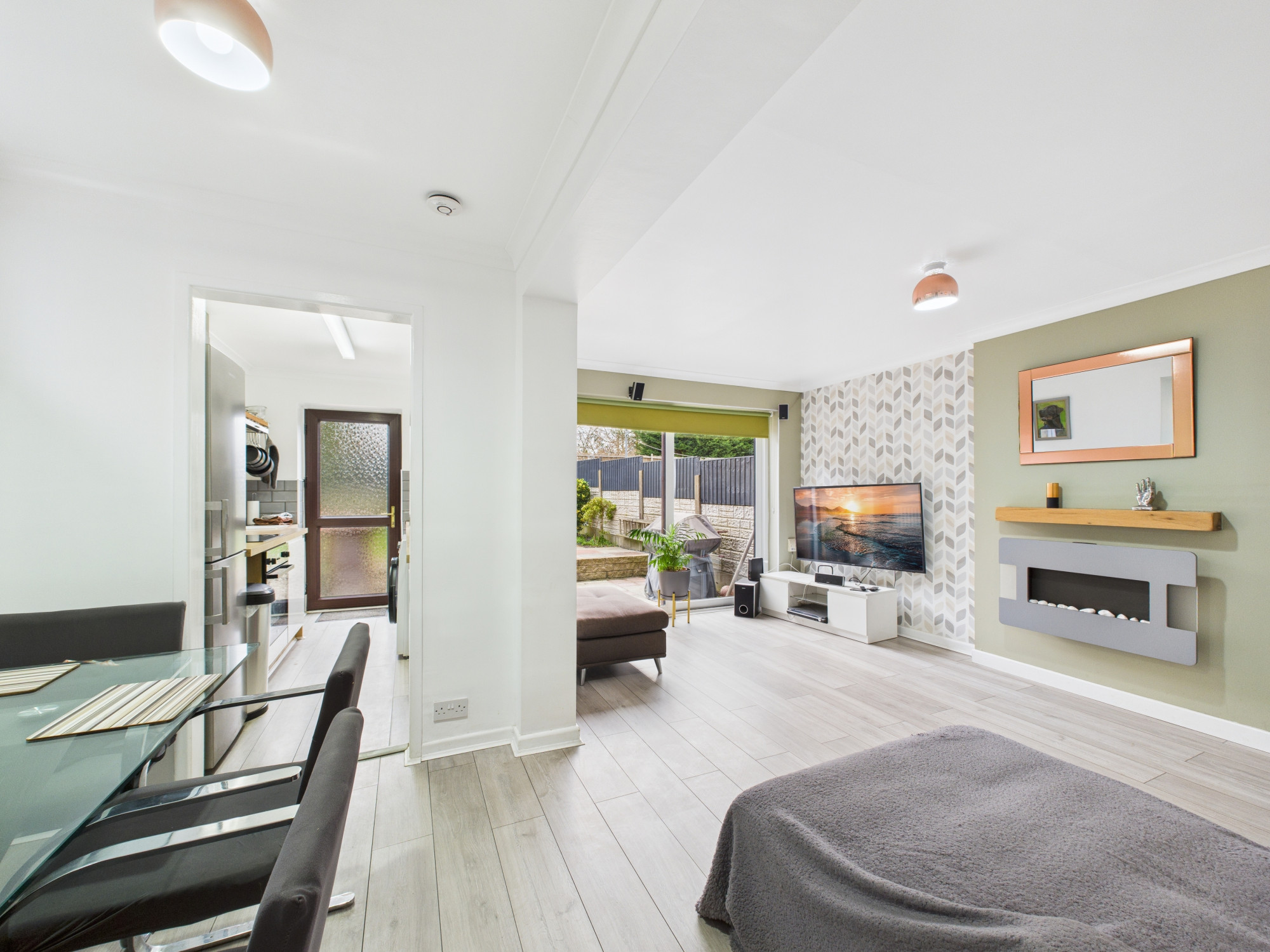 To the rear of the property is a bright and generous open-plan lounge and dining room, featuring an electric fire as a focal point and patio doors which open directly onto the rear garden. The garden is not overlooked, offering a good degree of privacy and creating an ideal space for relaxing or entertaining.