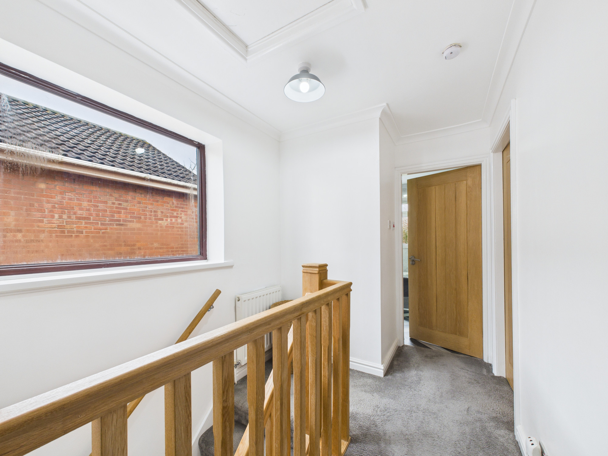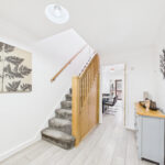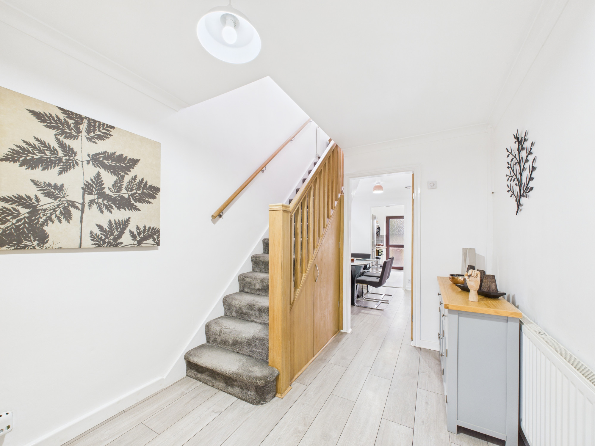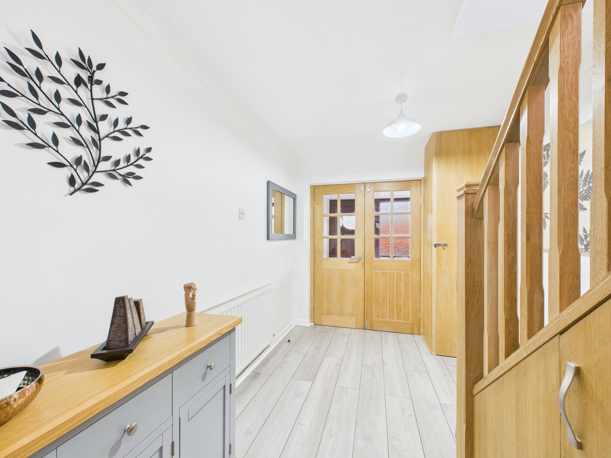 The accommodation begins with a welcoming porchway leading into a spacious entrance hallway, enhanced by attractive oak wood finishings and laminate flooring which continues throughout the ground floor. The hallway benefits from a useful storage cupboard as well as additional under-stairs storage, providing excellent practicality for everyday living.