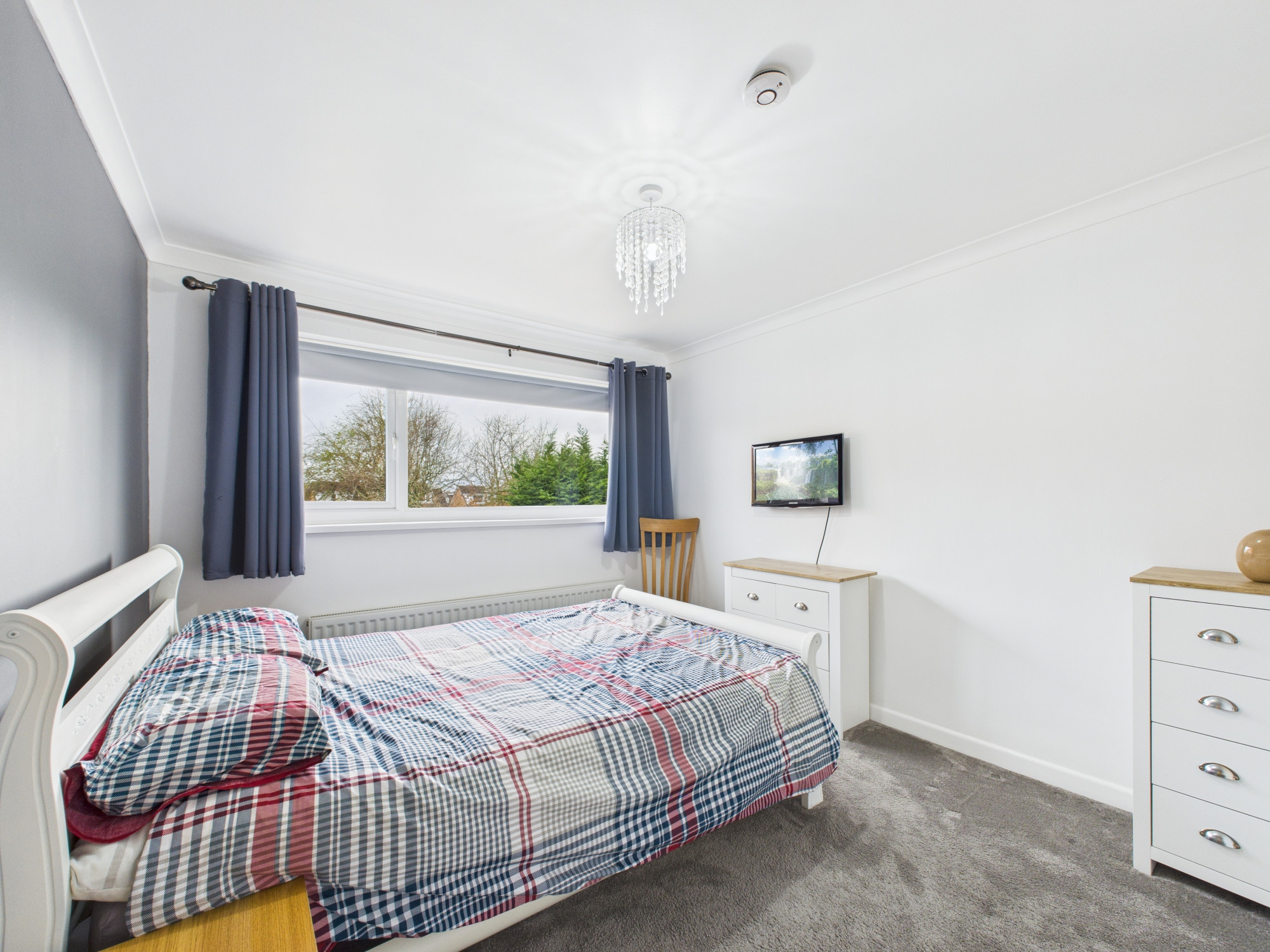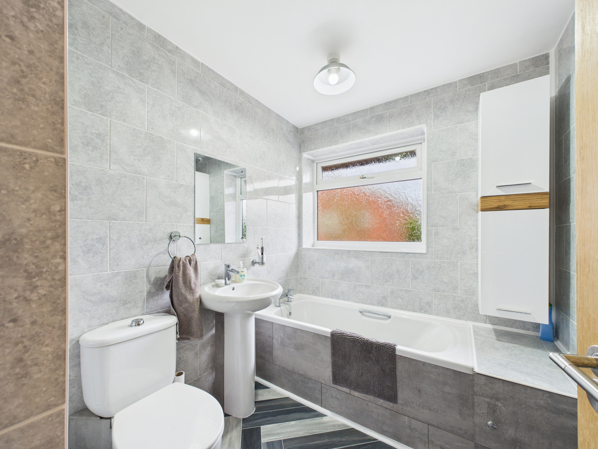 To the first floor, the property offers two well-proportioned double bedrooms, both benefiting from fitted storage, along with a further single bedroom. A modern four-piece family bathroom suite completes the upper-floor accommodation.