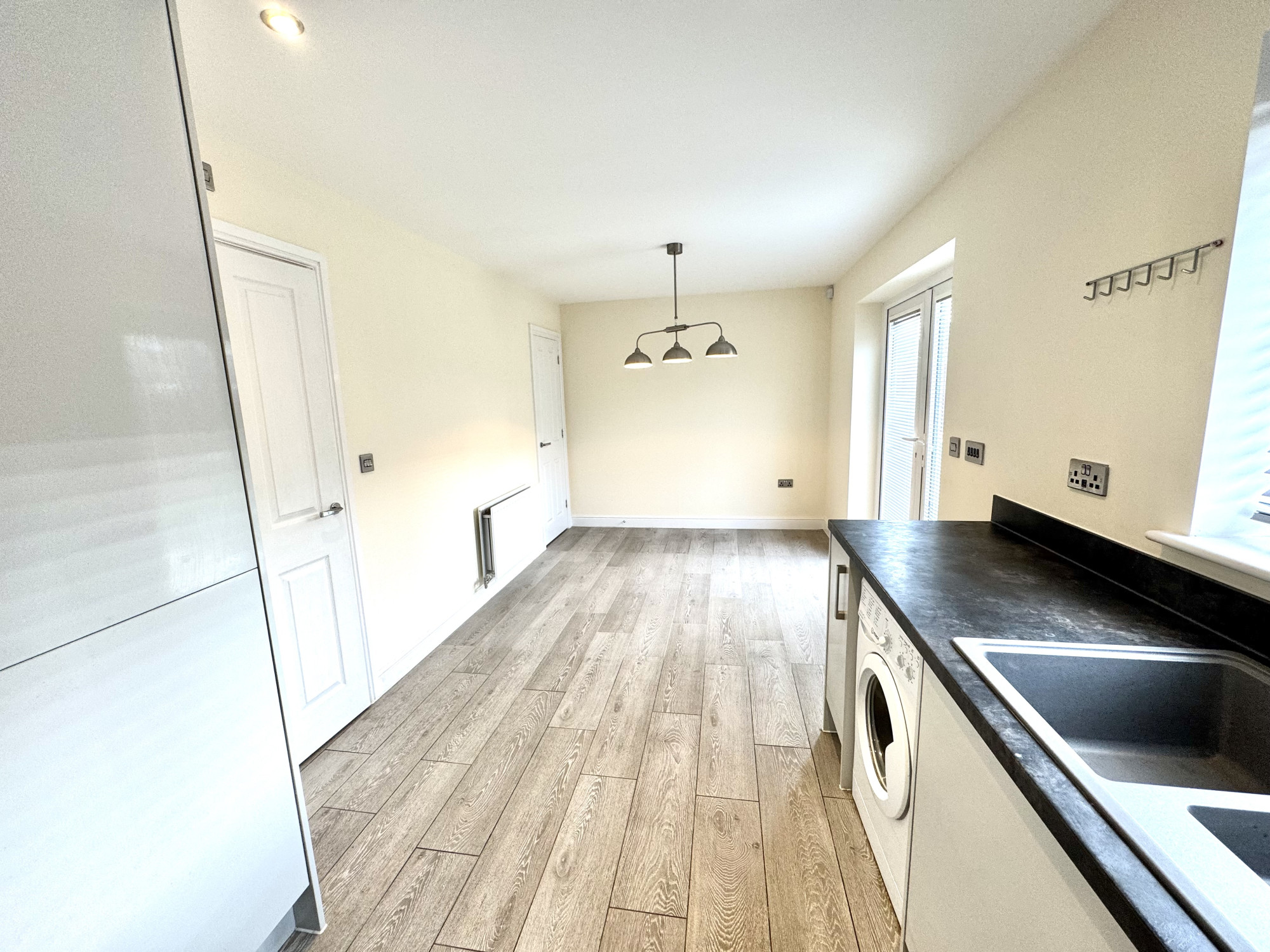 The open-plan kitchen, dining and family area is the heart of the home, and full-height windows that flood the room with light. A spacious lounge, stylish hallway, downstairs WC, and a main bathroom with double-ended bath and separate shower complete the interior.
