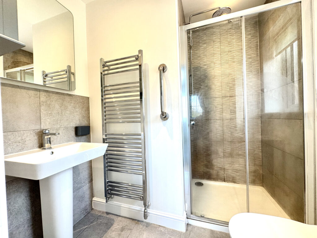 The spacious main bedroom with ample room for a double bed, wardrobes, and bedside tables. A private en-suite completes this sanctuary, featuring a rainfall shower for that perfect touch of luxury.