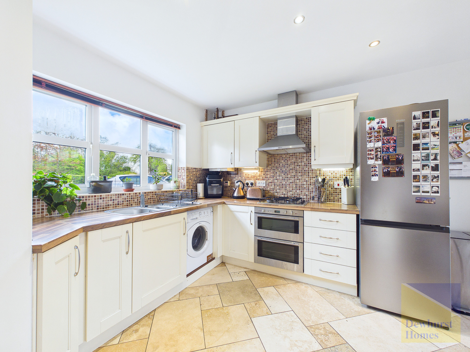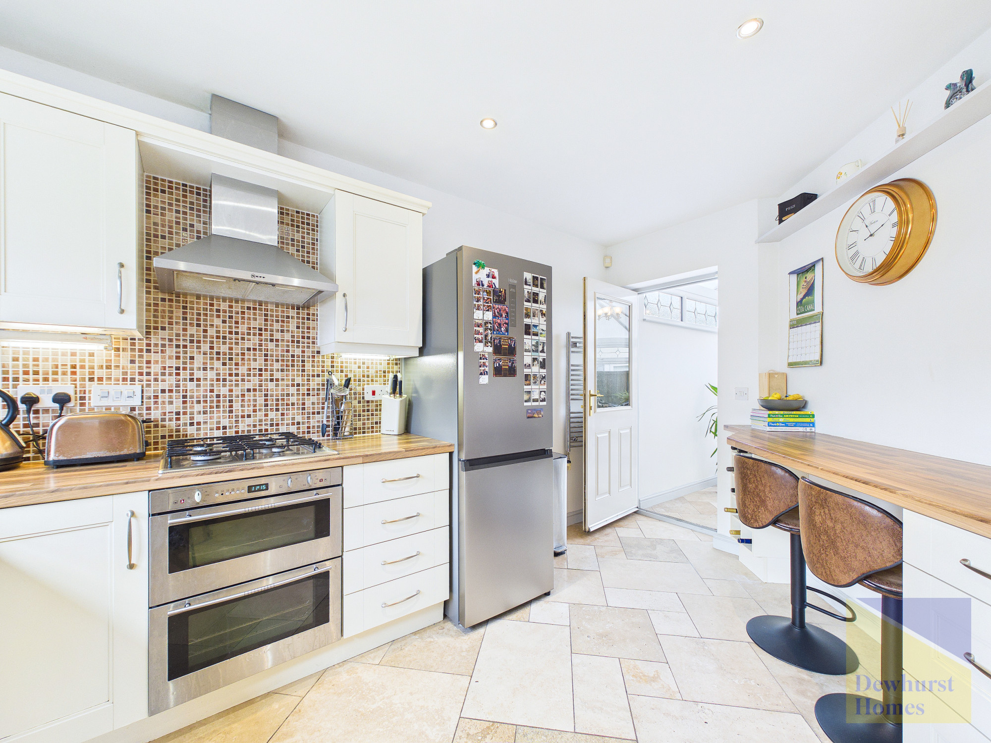 This contemporary home provides spacious and well-designed accommodation, ideal for modern family living. Upon entering, you are welcomed by a generous entrance hallway which gives access to all principal ground floor rooms. The modern fitted kitchen is bright and stylish, featuring a double integrated oven, gas hob, integrated dishwasher, and a range of cream wall and base units complemented by wood-effect work surfaces. A breakfast bar with an integrated wine rack adds both practicality and character, while a large front-facing bay window floods the space with natural light. The kitchen also provides access through to the conservatory.