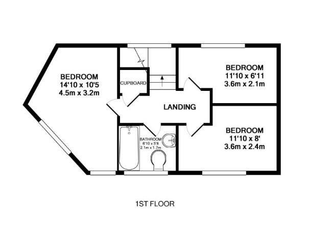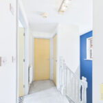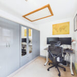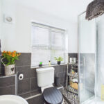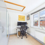 To the first floor, a central landing leads to three well-proportioned bedrooms. The principal bedroom is a spacious and uniquely laid out room with two front-facing windows, allowing for plenty of natural light. The remaining two bedrooms are situated to the rear and front respectively, both offering generous proportions, with the second bedroom also providing access to the loft via a pull-down hatch. The family bathroom is well-appointed, featuring a bath with electric shower, low-level W/C, pedestal wash basin, and distinctive tiled flooring.