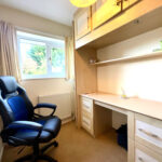 Upstairs, there are two well-proportioned double bedrooms with fitted furniture and a single bedroom currently used as a study/office. The modern family bathroom is fitted with an electric shower, heated towel rail, and vanity unit, complemented by an airing cupboard housing the Logic boiler. A large loft provides further storage potential.