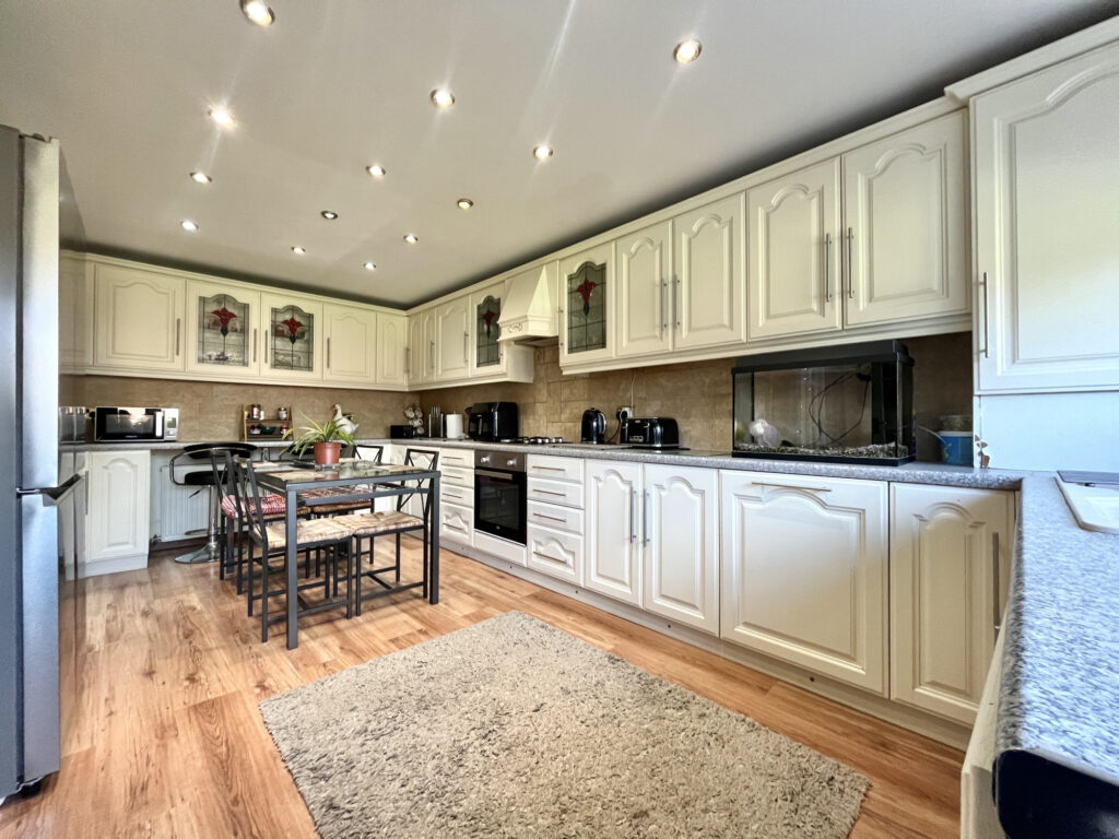 The heart of the home is the expansive kitchen diner, which provides ample storage and generous counter top space, ideal for culinary enthusiasts and family gatherings. Double doors from the lounge lead into this light-filled space, enhancing the open-plan feel.