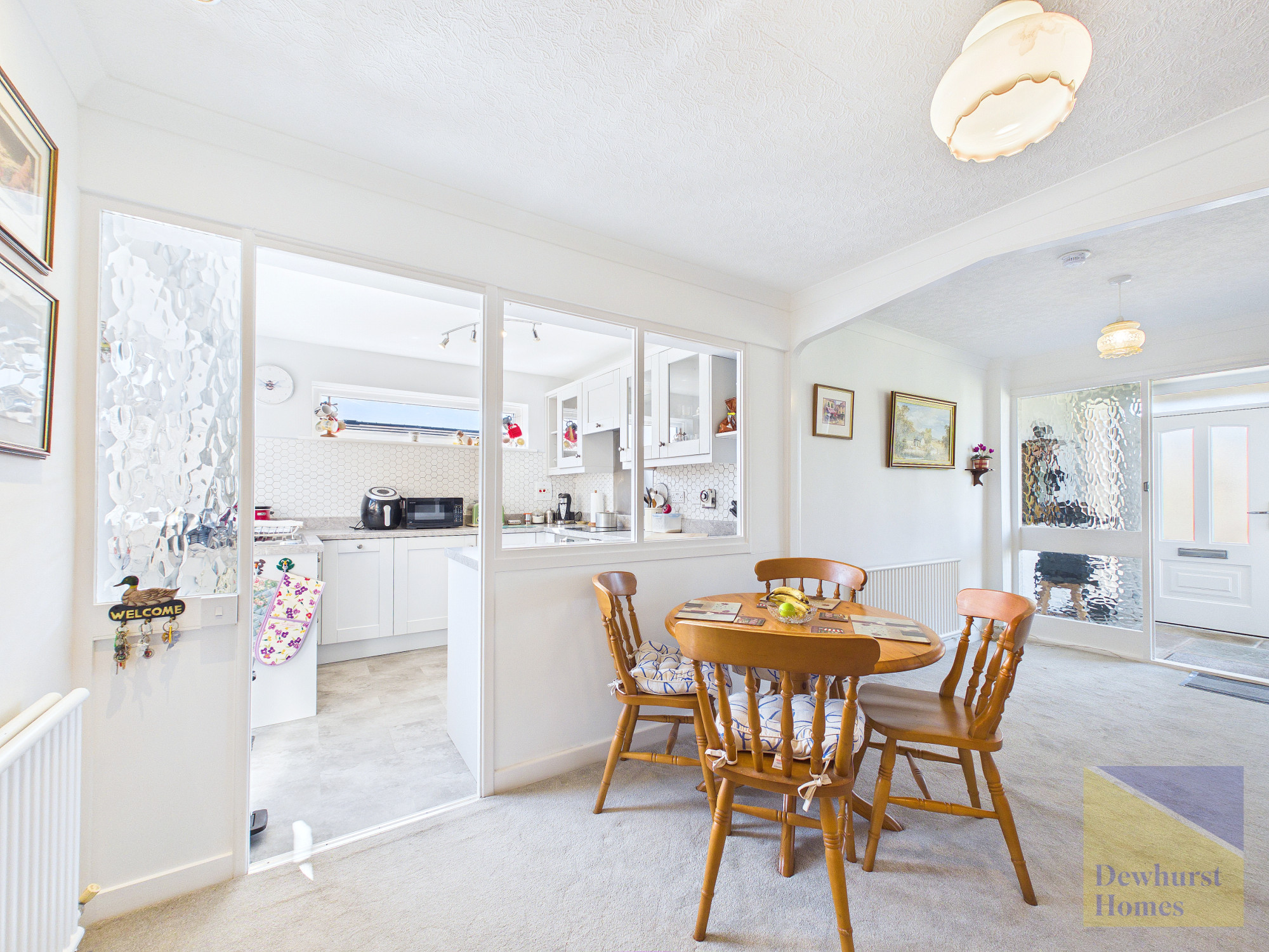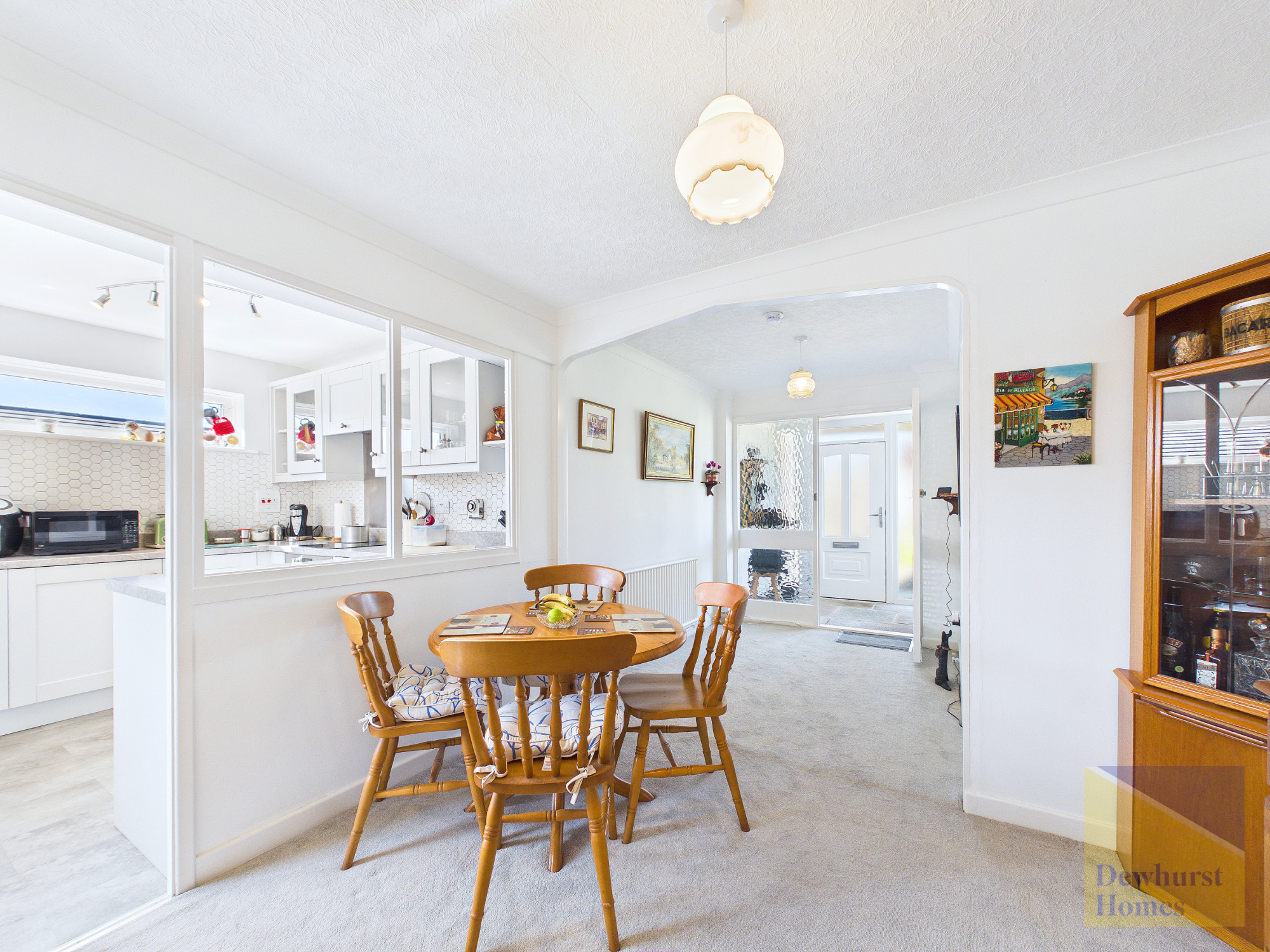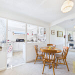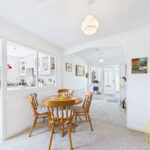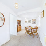 Internally, the bungalow has been thoughtfully adapted to maximise space and accessibility, making it particularly suitable for those seeking disabled-friendly accommodation. The entrance hallway is exceptionally generous, featuring grey carpeting and currently utilised as a dining area, offering excellent flexibility and potential to be reconfigured into a stunning open-plan kitchen diner if desired.