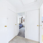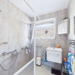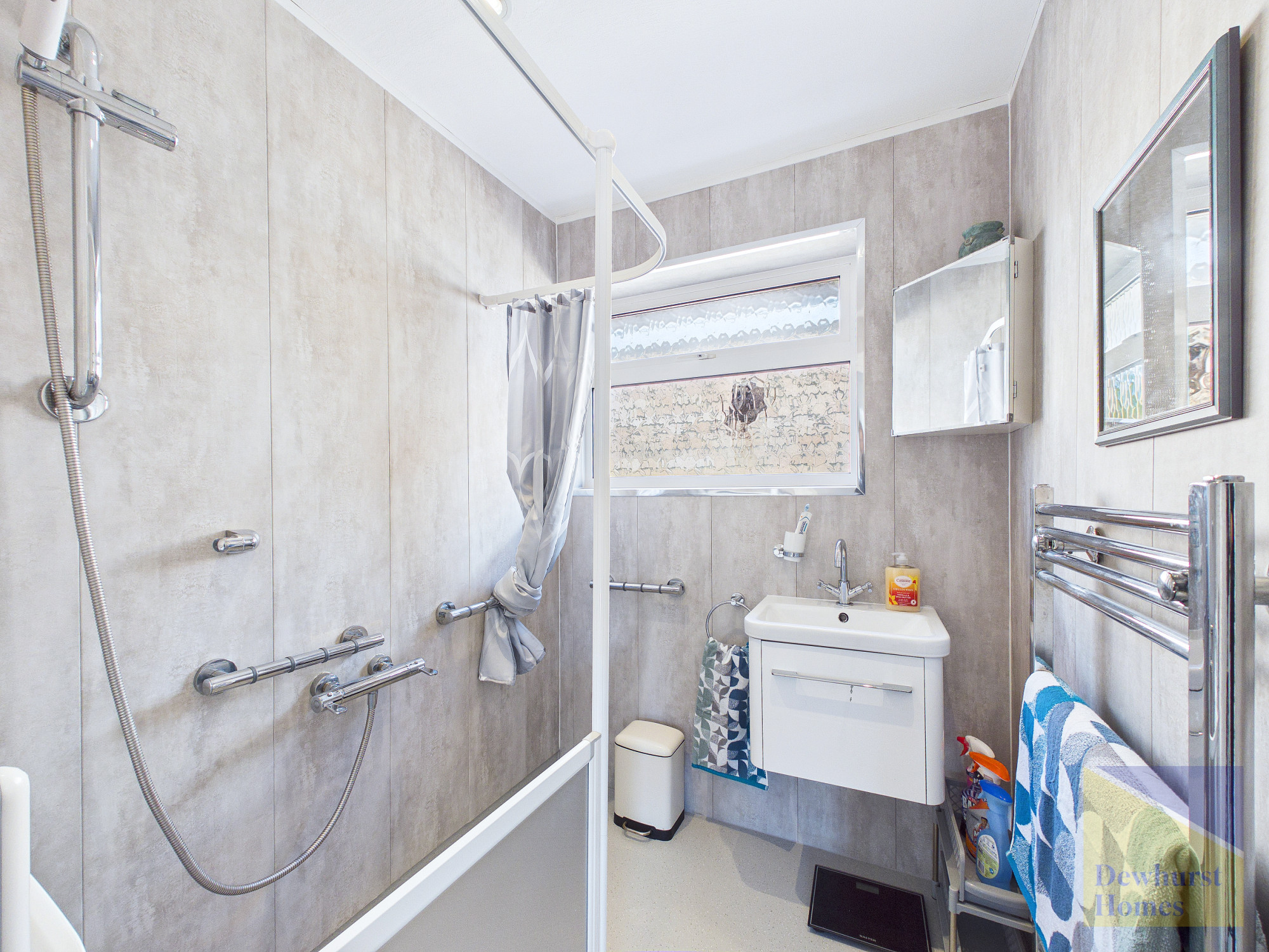 A secondary hallway features automatic lighting and provides access to two useful storage cupboards, along with a separate WC and a brand new, contemporary bathroom. The bathroom has been stylishly upgraded with a walk-in shower, vanity unit, and modern composite wall panels, offering both practicality and a sleek finish.