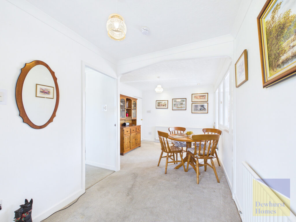 Internally, the bungalow has been thoughtfully adapted to maximise space and accessibility, making it particularly suitable for those seeking disabled-friendly accommodation. The entrance hallway is exceptionally generous, featuring grey carpeting and currently utilised as a dining area, offering excellent flexibility and potential to be reconfigured into a stunning open-plan kitchen diner if desired.
