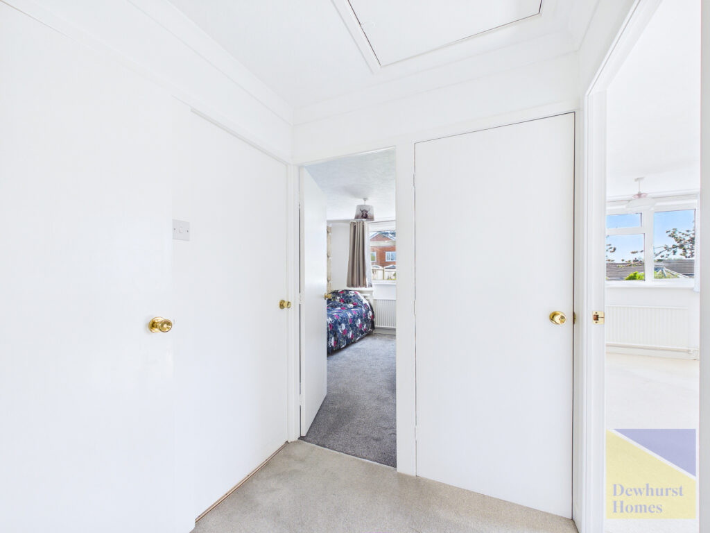 A secondary hallway features automatic lighting and provides access to two useful storage cupboards, along with a separate WC and a brand new, contemporary bathroom. The bathroom has been stylishly upgraded with a walk-in shower, vanity unit, and modern composite wall panels, offering both practicality and a sleek finish.