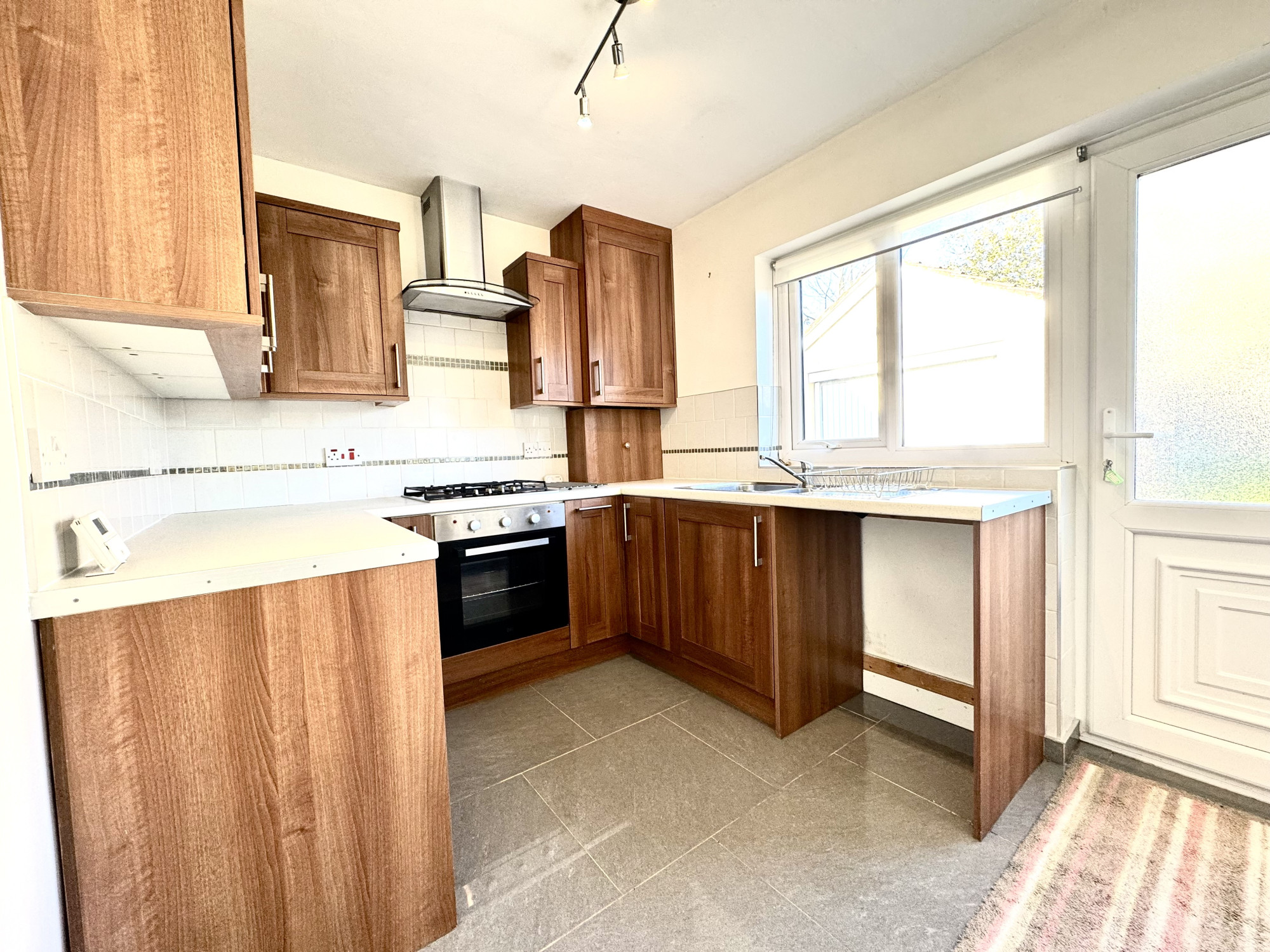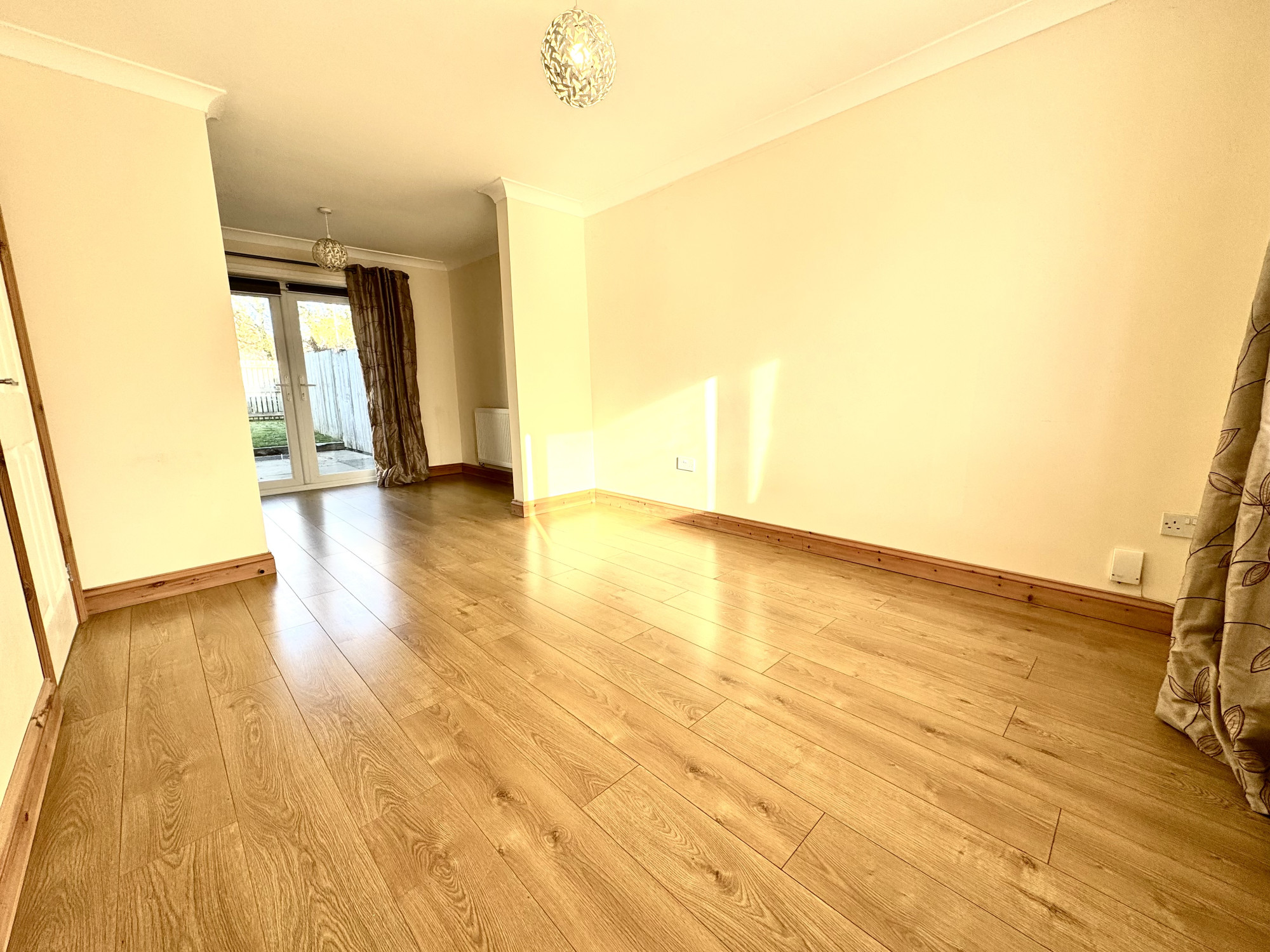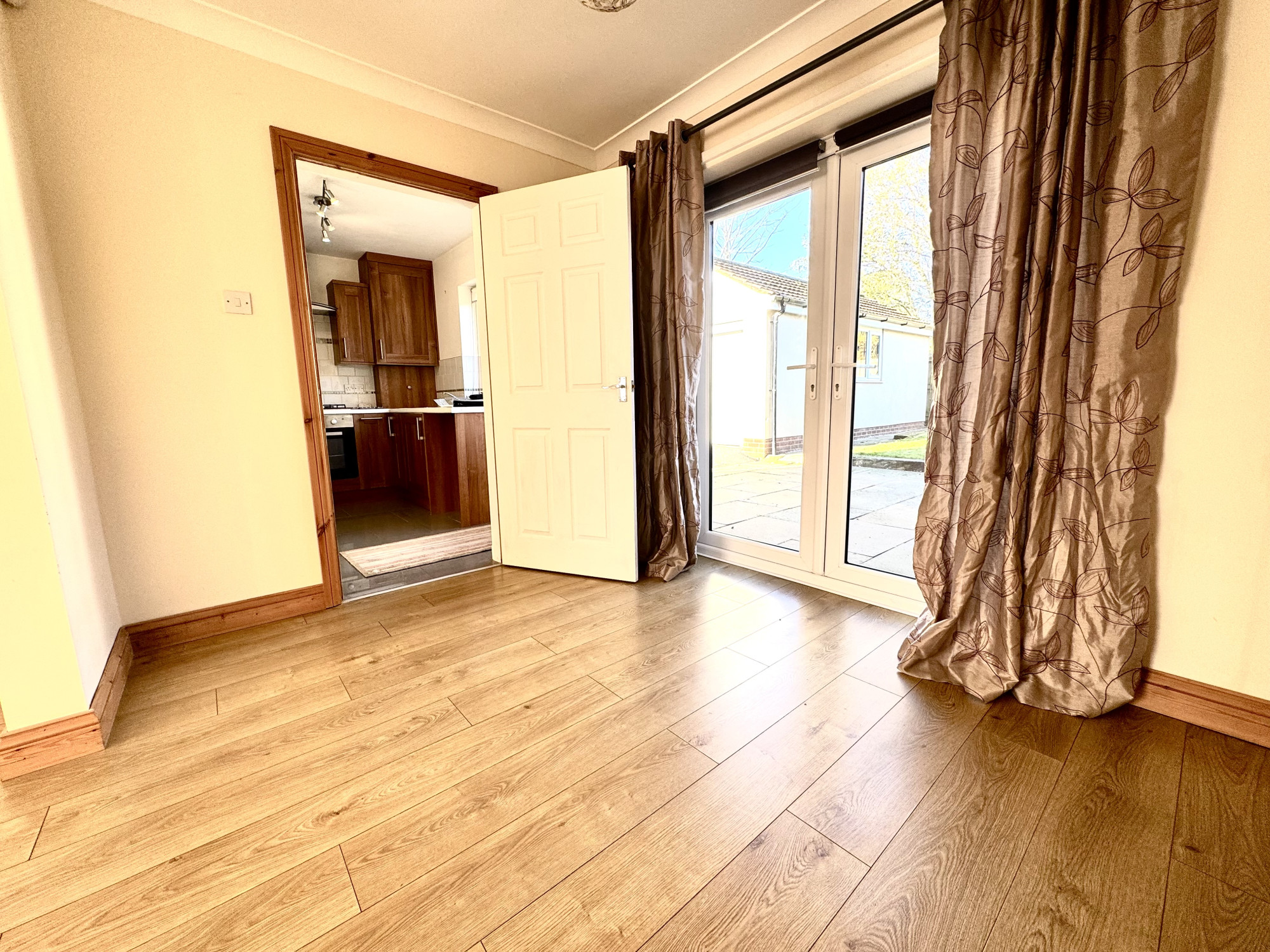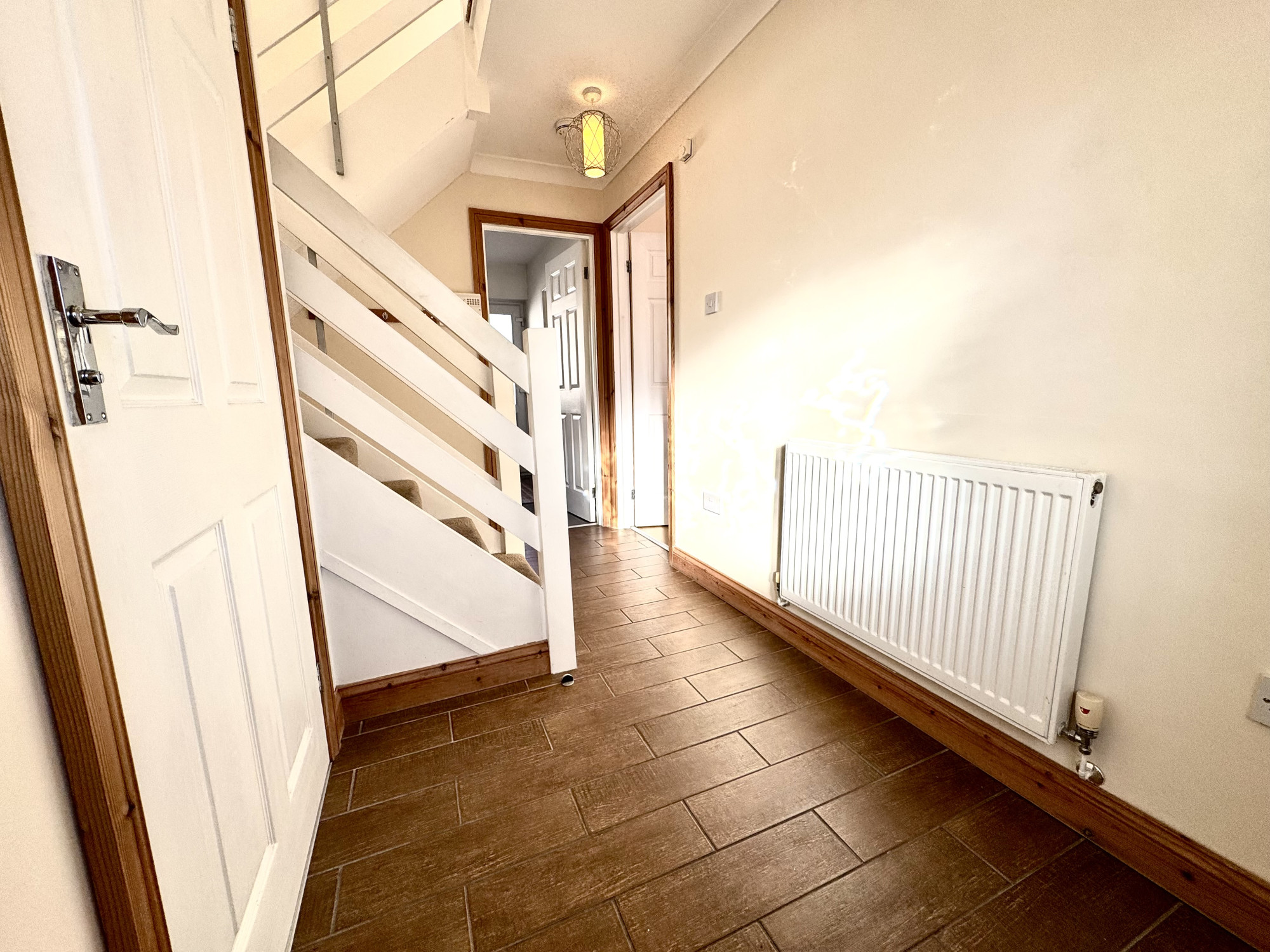 Internally, you’re welcomed into a bright entrance hallway with tiled flooring, leading to a particularly spacious downstairs WC — ideal for busy family life. The generous lounge/dining room offers a warm and versatile living space with patio doors opening directly onto the rear garden, creating a seamless indoor-outdoor connection. The kitchen is well-fitted with hardwood units, a fully serviced Vaillant boiler, tiled flooring, and a rear access door to the garden — perfect for everyday convenience.