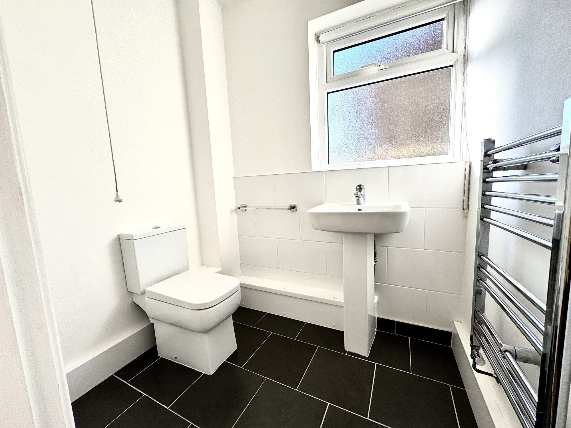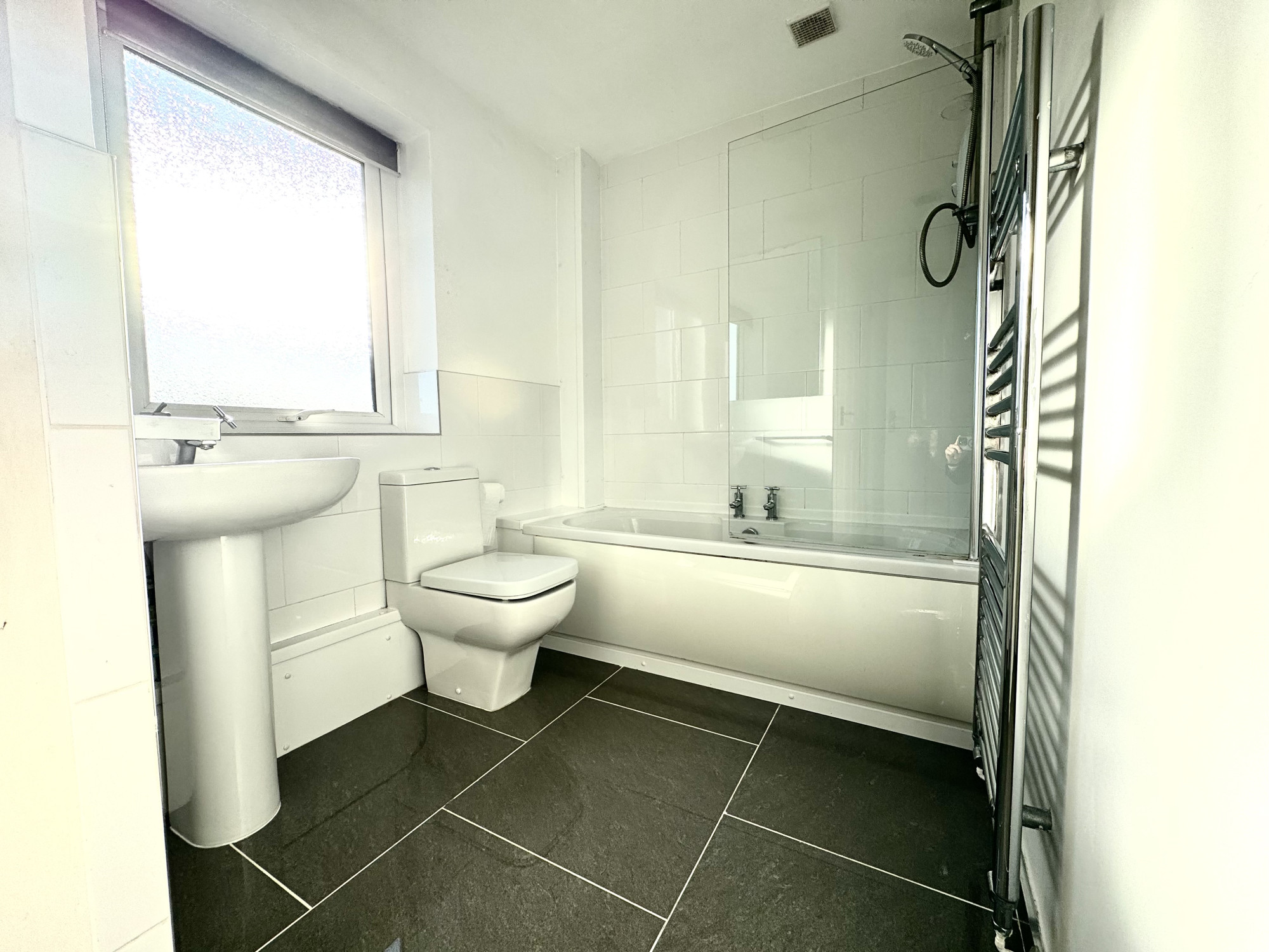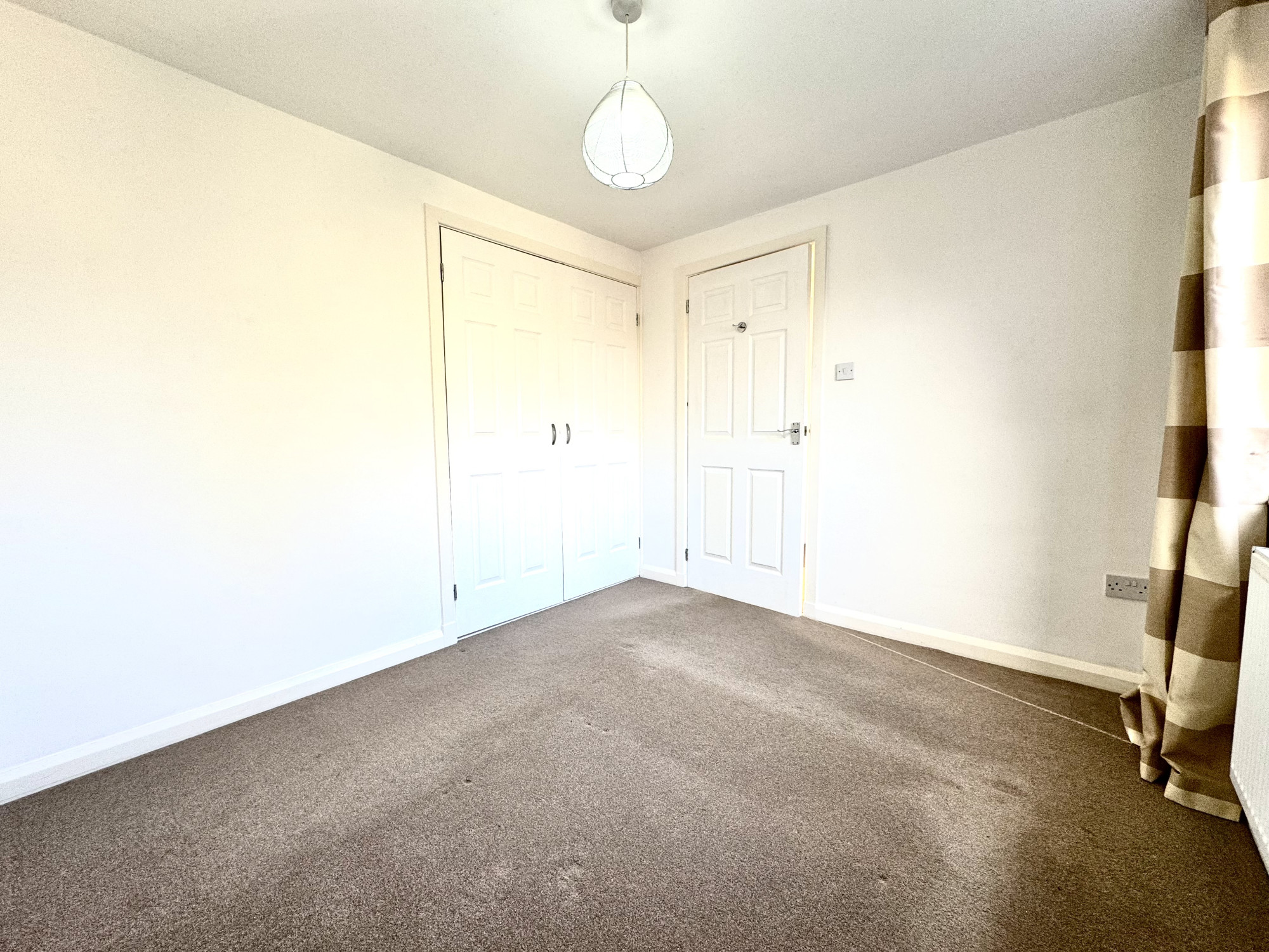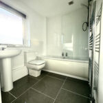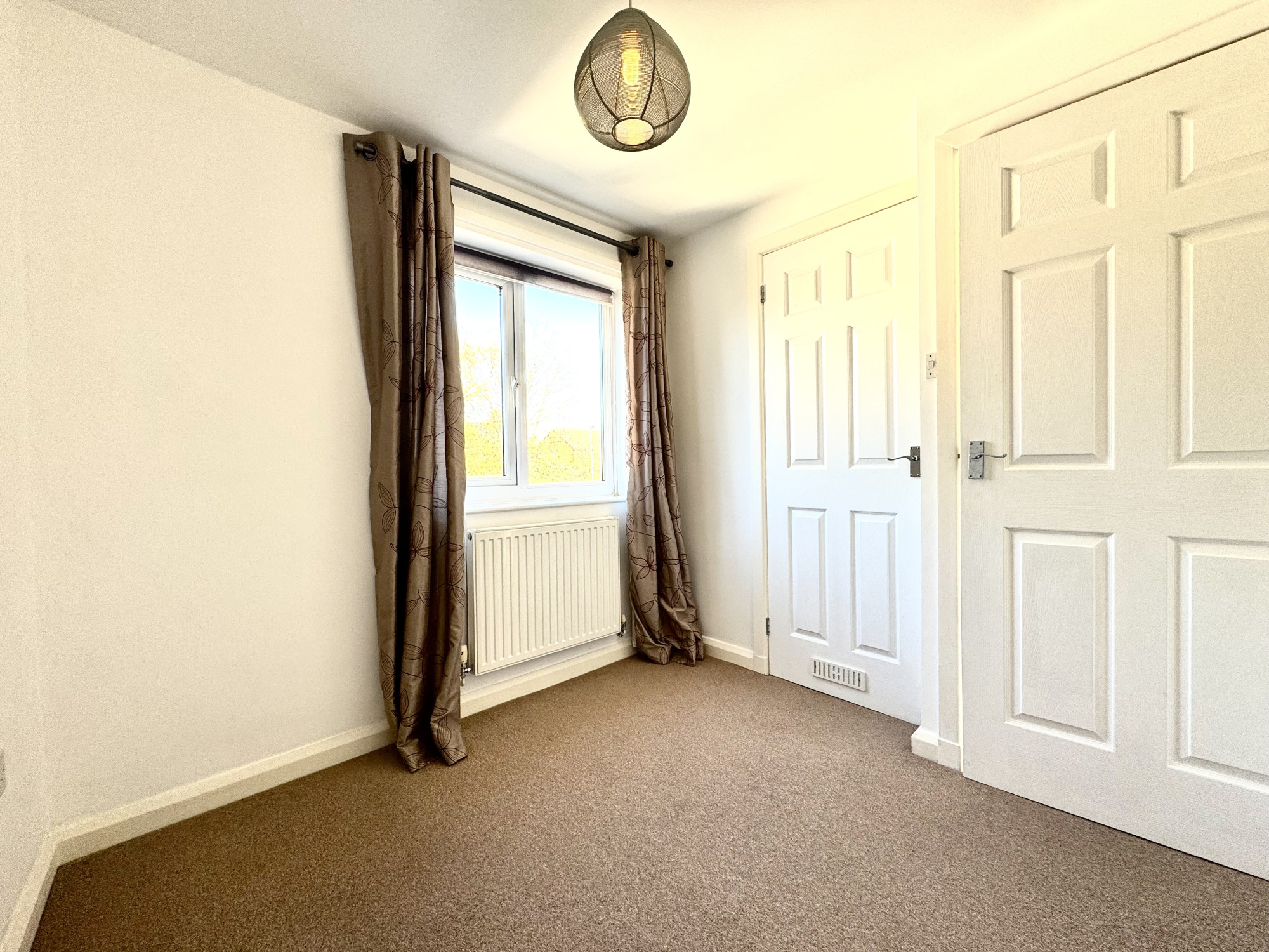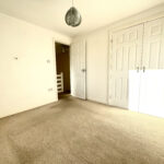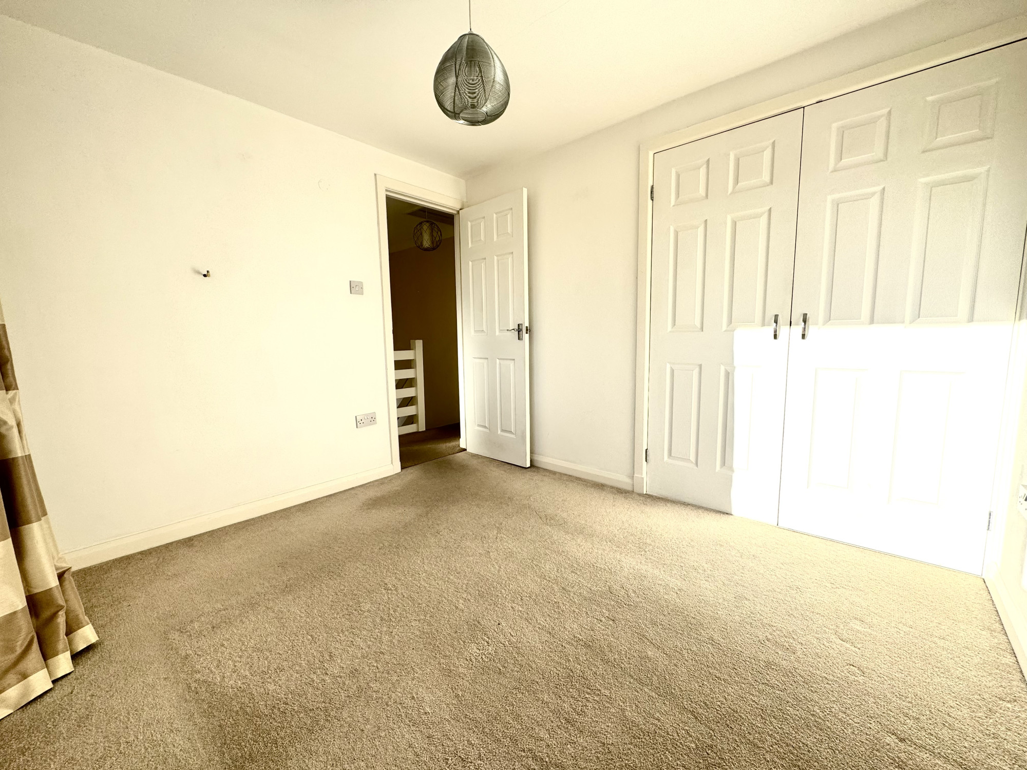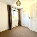A split-level staircase leads to the first floor, where you’ll find three well-proportioned bedrooms — two doubles and a single — all featuring built-in storage. The family bathroom is fitted with a modern white three-piece suite, including an electric shower over the bath. Additional loft space offers handy storage potential.