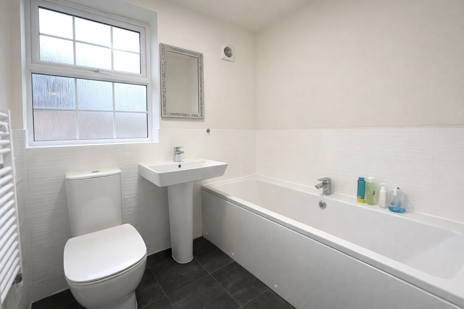 Patio doors from the kitchen diner open onto a tranquil, low-maintenance rear garden that has been thoughtfully designed by the current owners. The garden features a flagged patio area ideal for outdoor seating and a large lawned area, perfect for children and family enjoyment.