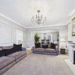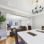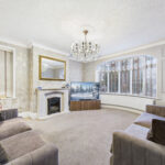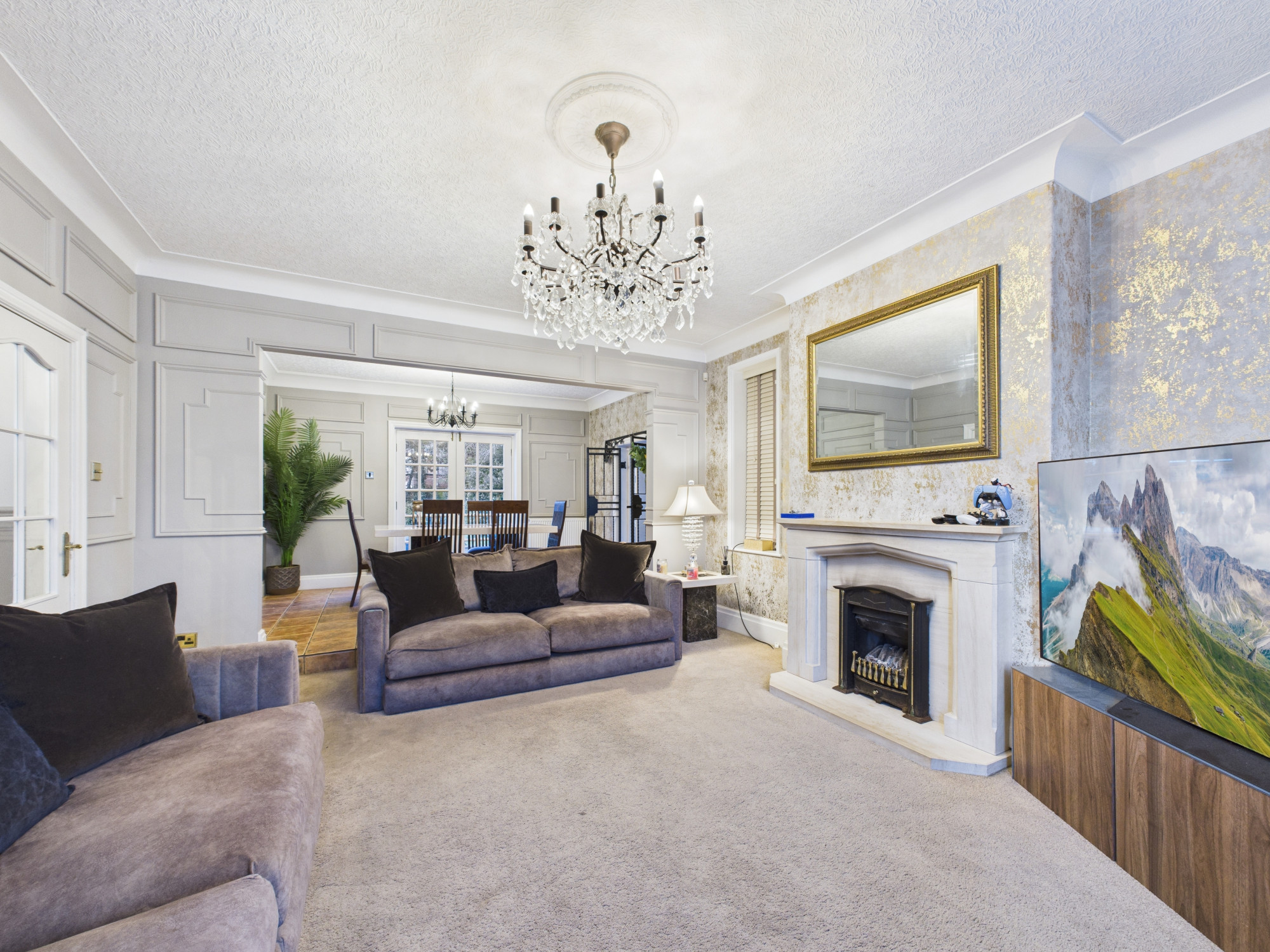 Upon entering, you are welcomed by a spacious and inviting entrance hallway that sets the tone for the rest of this impressive home. This leads through to a stunning, open-plan lounge of generous proportions, complemented by a raised dining area. The room showcases a beautiful large feature bay window, an attractive feature fireplace, elegant wall panelling, a decorative ceiling rose, and classic coving, all combining to create a warm and character-filled living space.