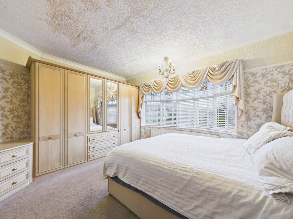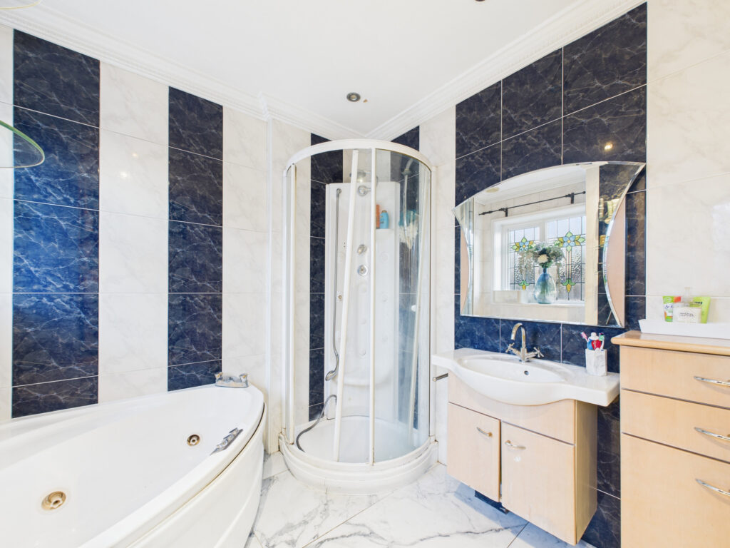To the first floor, the property continues to impress. The main bedroom is an exceptionally large double, featuring extensive fitted wardrobes, a dressing table, and additional fitted furniture. The second bedroom is also a very spacious double, while the third is a generous single room. The family bathroom is well-appointed and features a four-piece suite, including a corner shower and a corner spa bath.