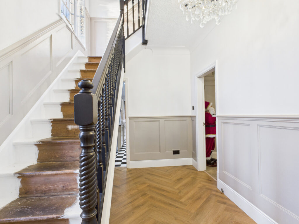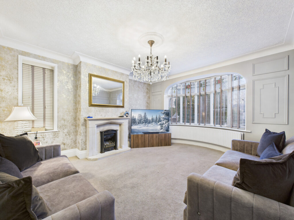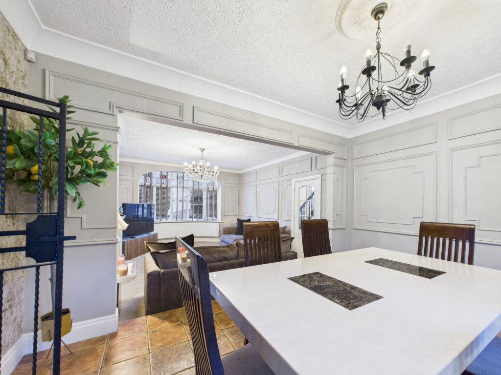 Upon entering, you are welcomed by a spacious and inviting entrance hallway that sets the tone for the rest of this impressive home. This leads through to a stunning, open-plan lounge of generous proportions, complemented by a raised dining area. The room showcases a beautiful large feature bay window, an attractive feature fireplace, elegant wall panelling, a decorative ceiling rose, and classic coving, all combining to create a warm and character-filled living space.