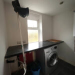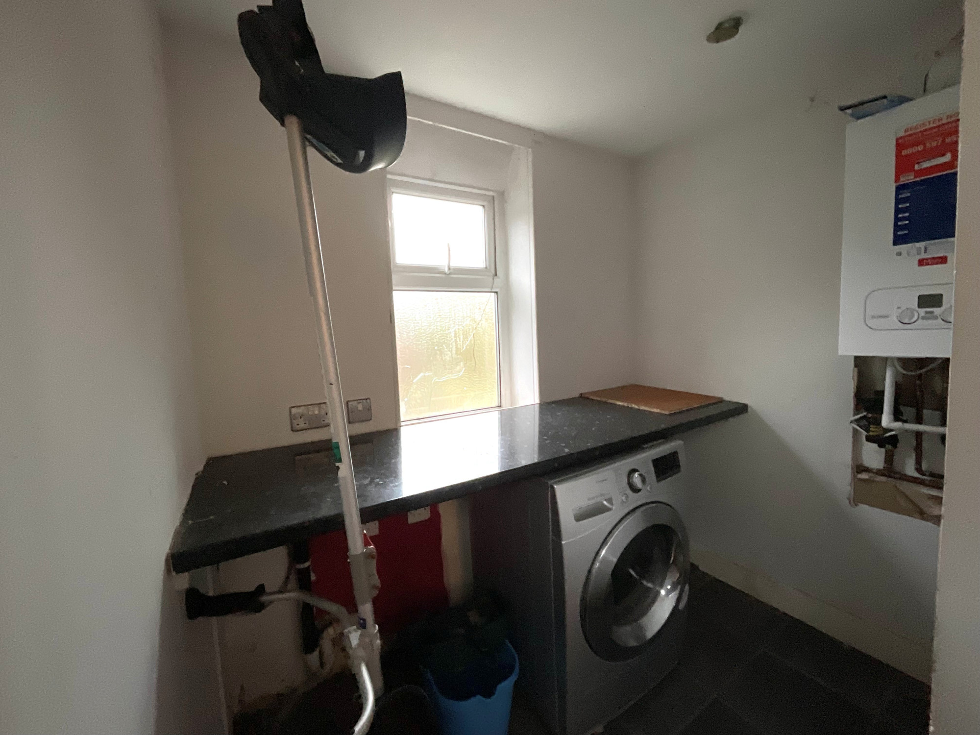 The kitchen is fitted with a range of wall and base units and includes a built-in oven, hob and extractor hood, stainless steel sink with mixer tap, part tiled walls, central heating radiator and a double glazed window. Adjacent to the kitchen is a practical utility room, plumbed for a washing machine and offering additional storage, with a further double glazed window.