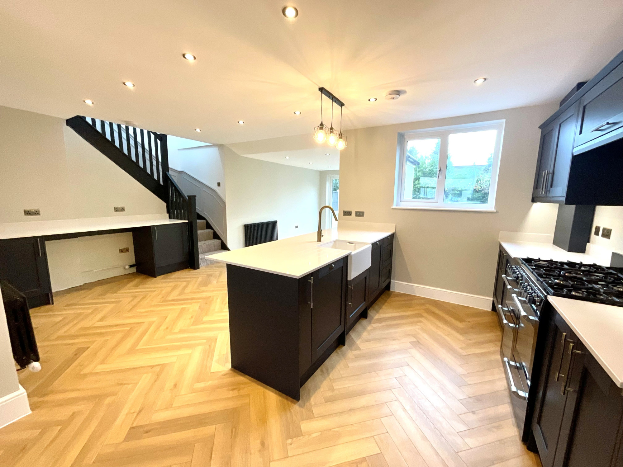 The heart of the home is the open-plan kitchen, dining, and family area β€” a stylish and inviting space ideal for modern living. The bespoke kitchen features quartz worktops, an integrated fridge freezer, dishwasher, and a Cookmaster range, complemented by a utility wall with plumbing for a washing machine and a new Worcester boiler. The herringbone flooring adds warmth and texture, while the open fire/log burner potential creates a perfect focal point for family gatherings.