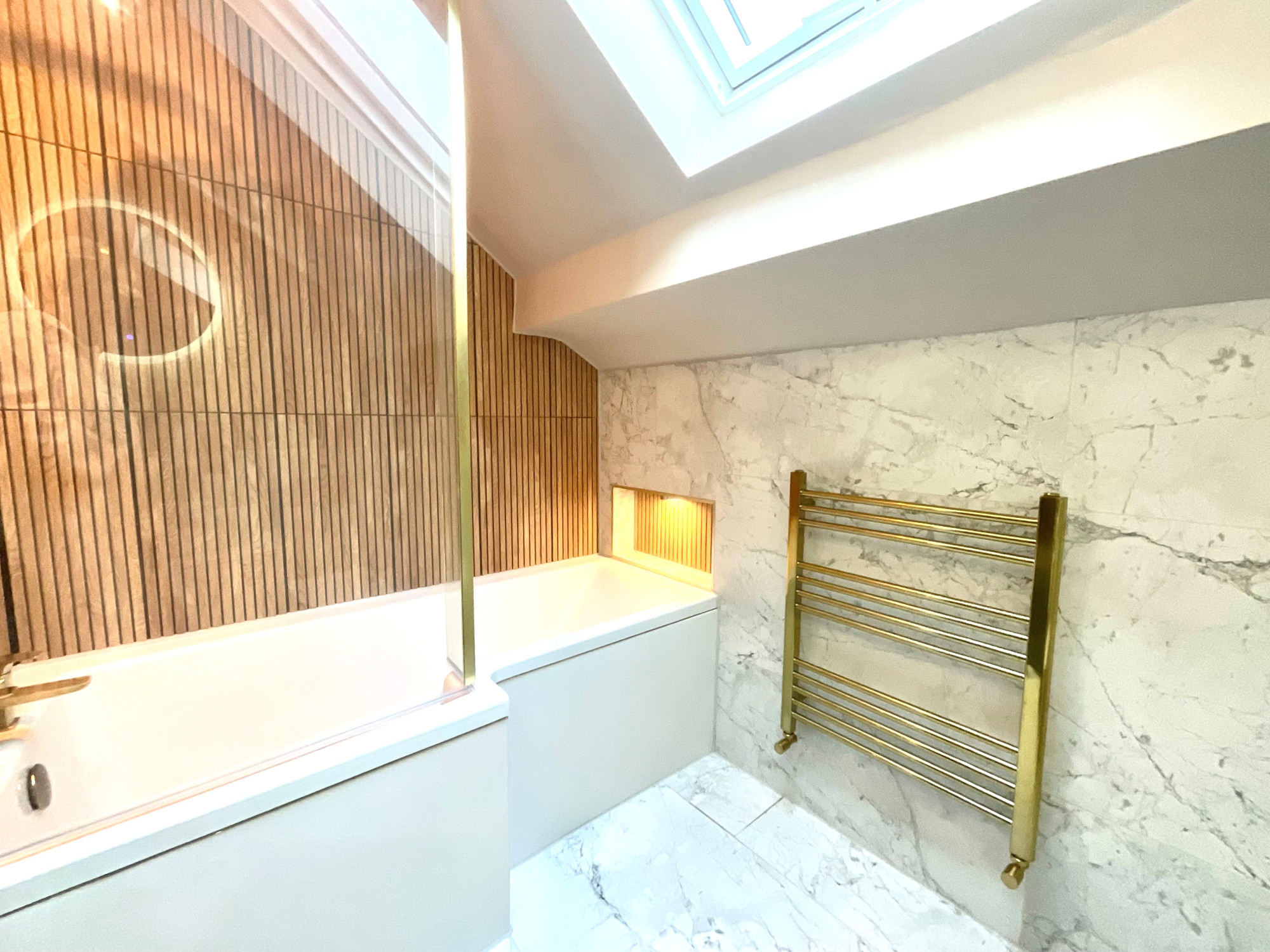 The main family bathroom is a showstopper β€” fully tiled with gold finishes, LED mirrors, and underfloor heating, offering a touch of everyday luxury.