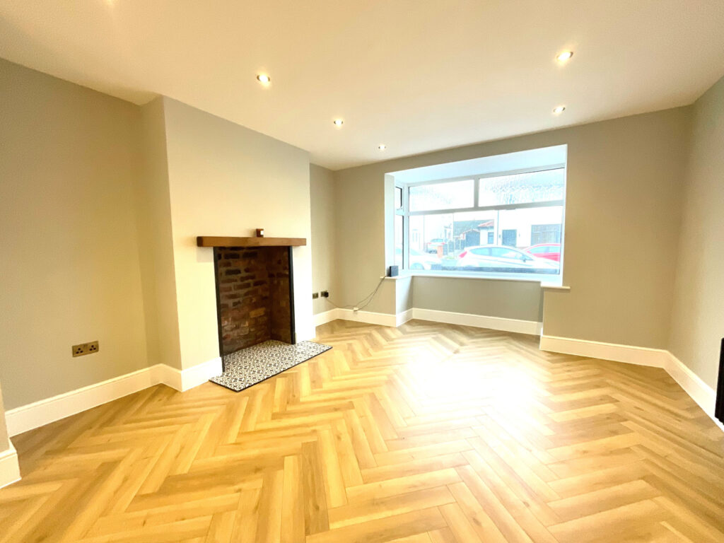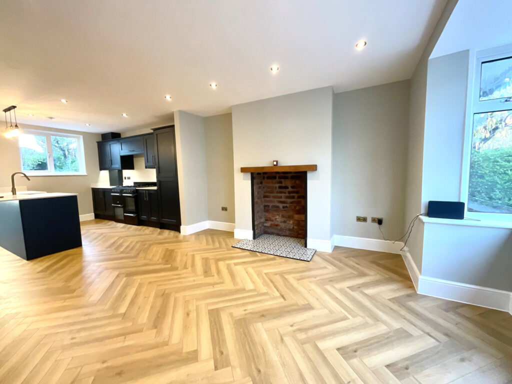 The heart of the home is the open-plan kitchen, dining, and family area — a stylish and inviting space ideal for modern living. The bespoke kitchen features quartz worktops, an integrated fridge freezer, dishwasher, and a Cookmaster range, complemented by a utility wall with plumbing for a washing machine and a new Worcester boiler. The herringbone flooring adds warmth and texture, while the open fire/log burner potential creates a perfect focal point for family gatherings.