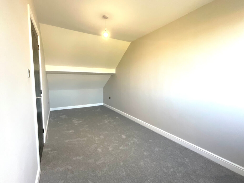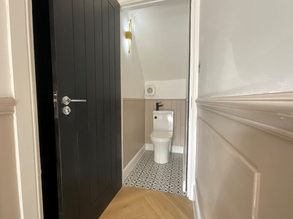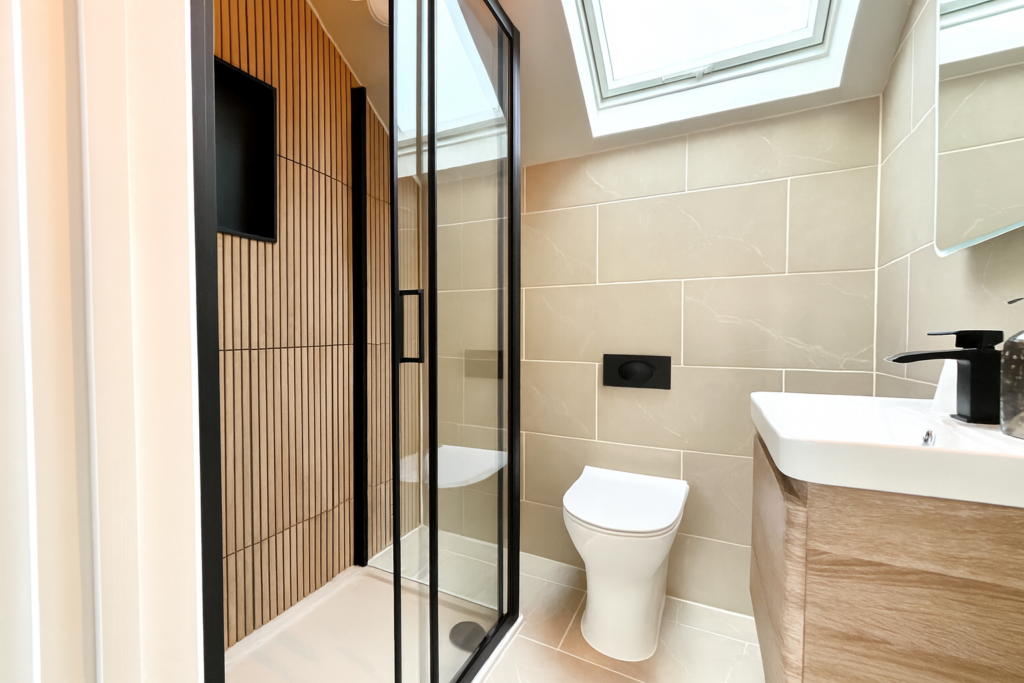 Upstairs, you’ll find two further double bedrooms, including a luxurious master suite featuring an ensuite shower room with underfloor heating, a waterfall shower, and matt black finishes. The master bedroom also boasts walk-in-style modern built-in wardrobes with LED lighting, creating a boutique hotel feel.