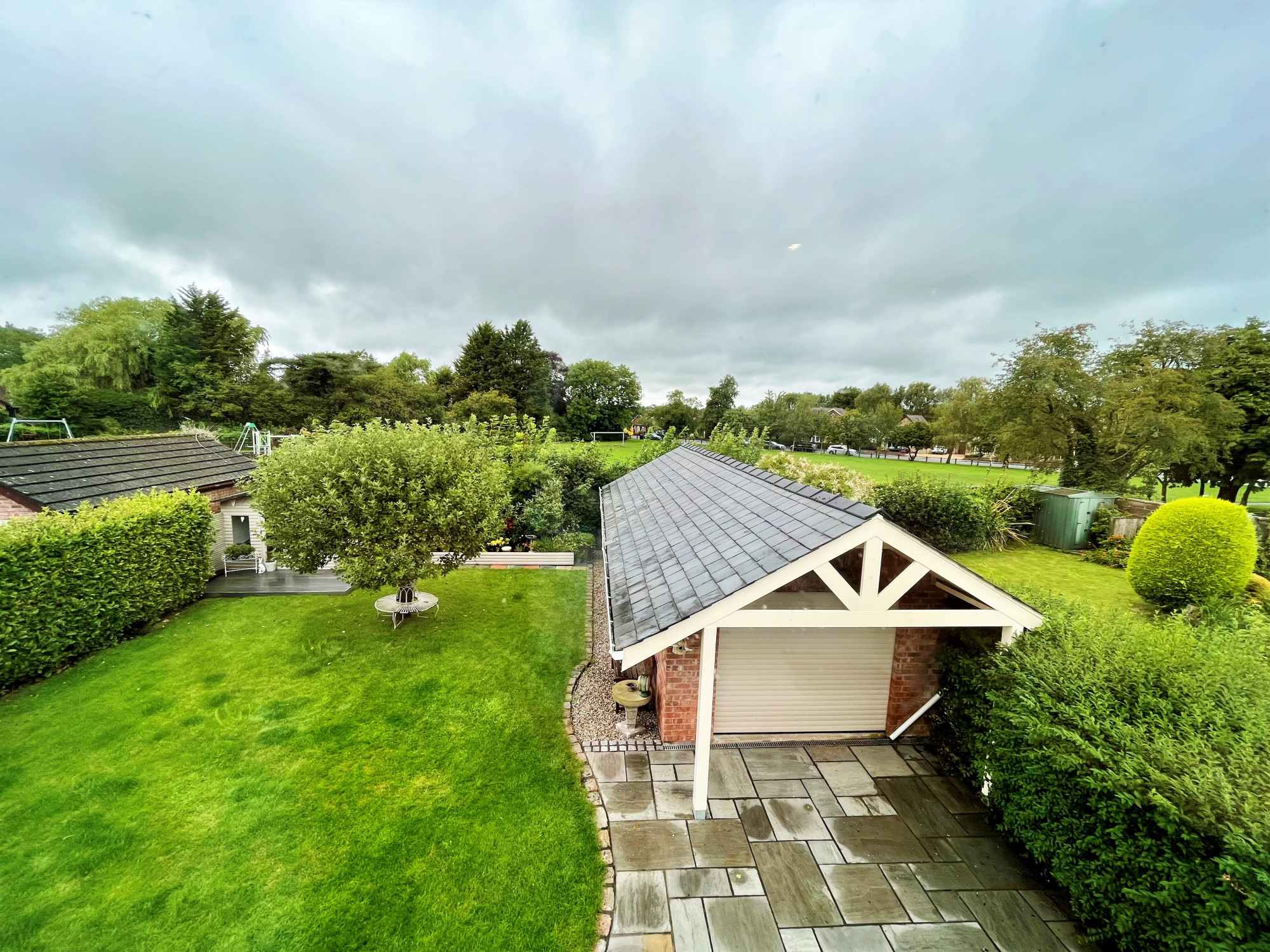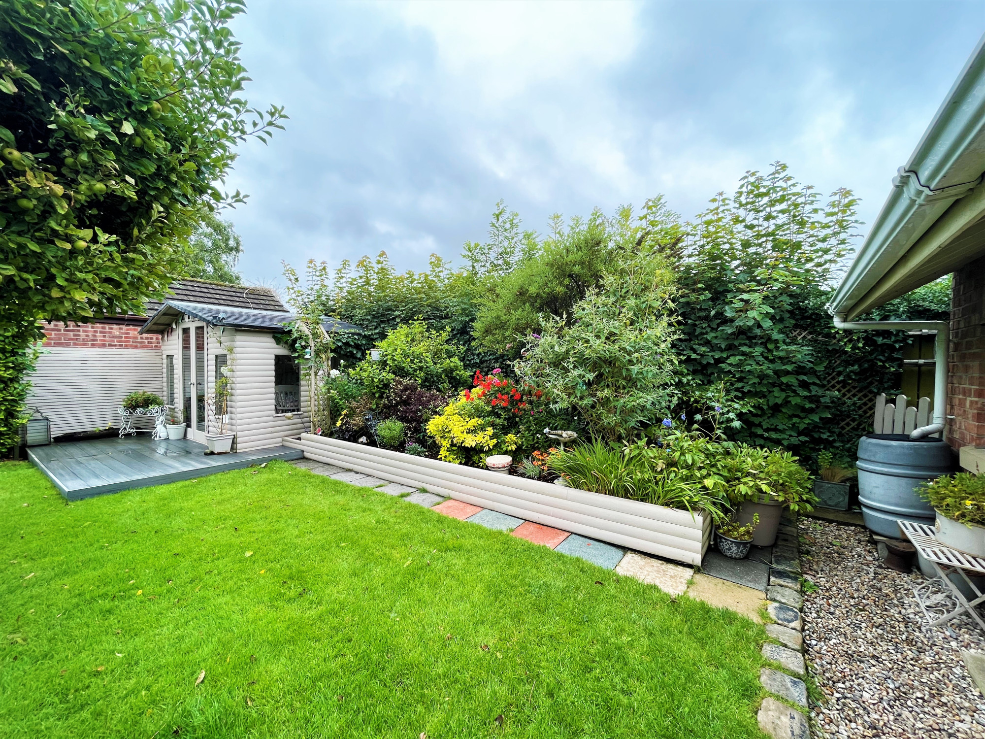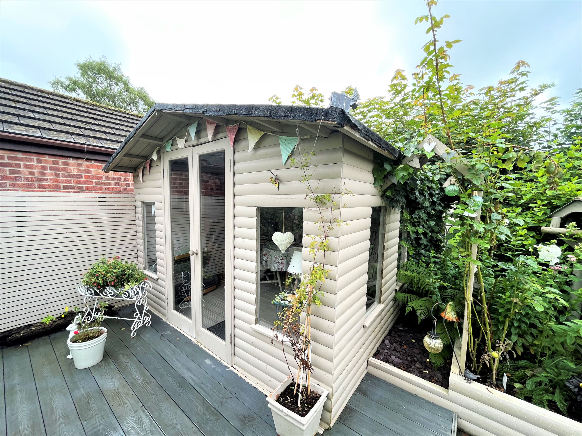 To the front of the property is a large driveway which is accessed by the sliding gate. With parking for several vehicles and access to the rear of the property and double length garage. With a lawned garden to the side with established trees and planting. The rear garden is spacious and has a large Indian stone patio, lawn with beautiful apple tree. Established raised planting area to the rear with a variety of plants and shrubbery. A decked area leads to the garden room which would be ideal for entertaining or as a play room. The detached double garage has an electric up and over door and can park two vehicles. The space is currently used as a workshop, the garage also has a WC and wash hand basin. An additional gate to the side provides access to the hidden bin storage area.Β