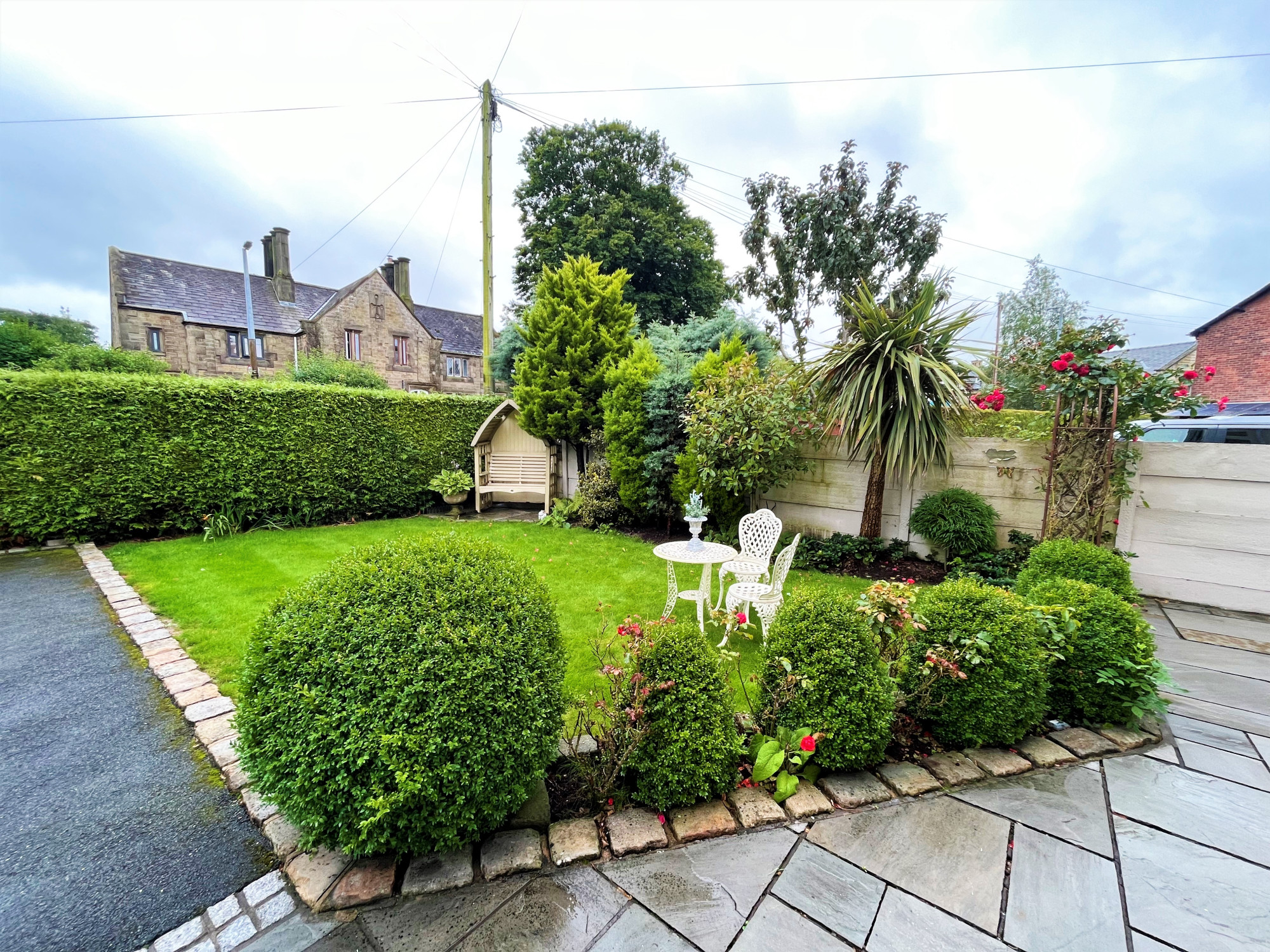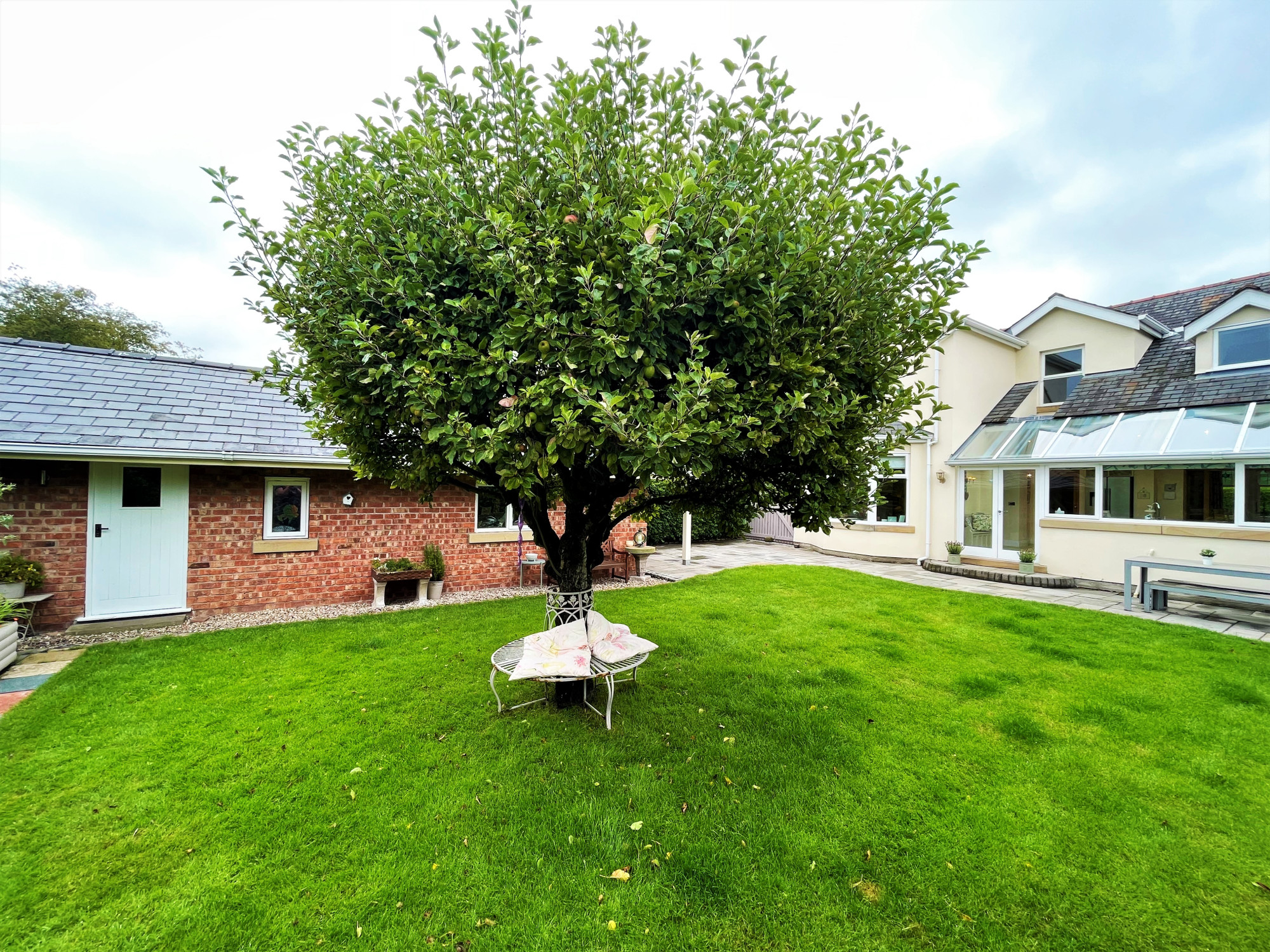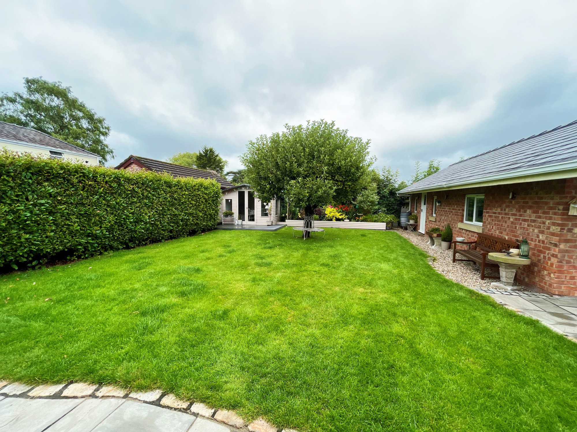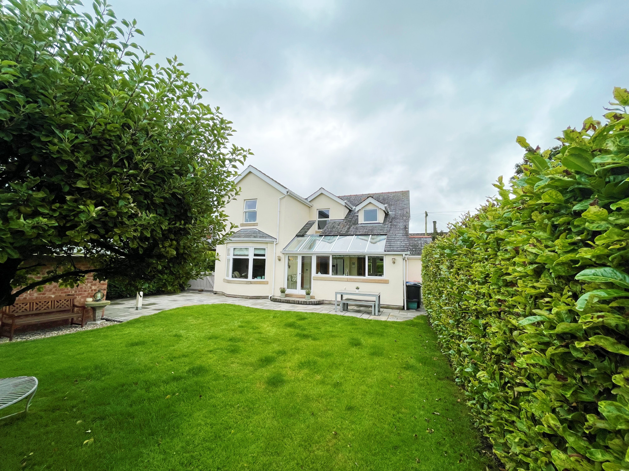 To the front of the property is a large driveway which is accessed by the sliding gate. With parking for several vehicles and access to the rear of the property and double length garage. With a lawned garden to the side with established trees and planting. The rear garden is spacious and has a large Indian stone patio, lawn with beautiful apple tree. Established raised planting area to the rear with a variety of plants and shrubbery. A decked area leads to the garden room which would be ideal for entertaining or as a play room. The detached double garage has an electric up and over door and can park two vehicles. The space is currently used as a workshop, the garage also has a WC and wash hand basin. An additional gate to the side provides access to the hidden bin storage area.Β