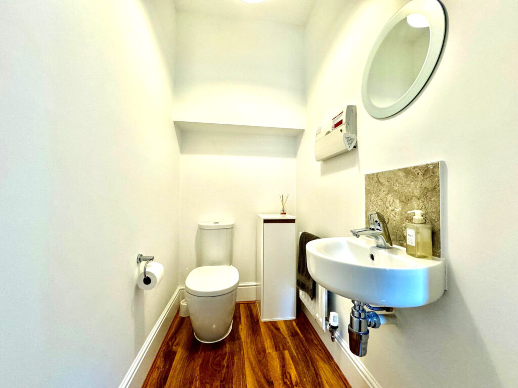 The landscaped rear garden offers a peaceful retreat, perfect for enjoying outdoor activities or simply unwinding amidst the natural beauty. Additionally, the property features a quality kitchen, ground floor w/c, and a driveway with parking, ensuring convenience and comfort for its residents.